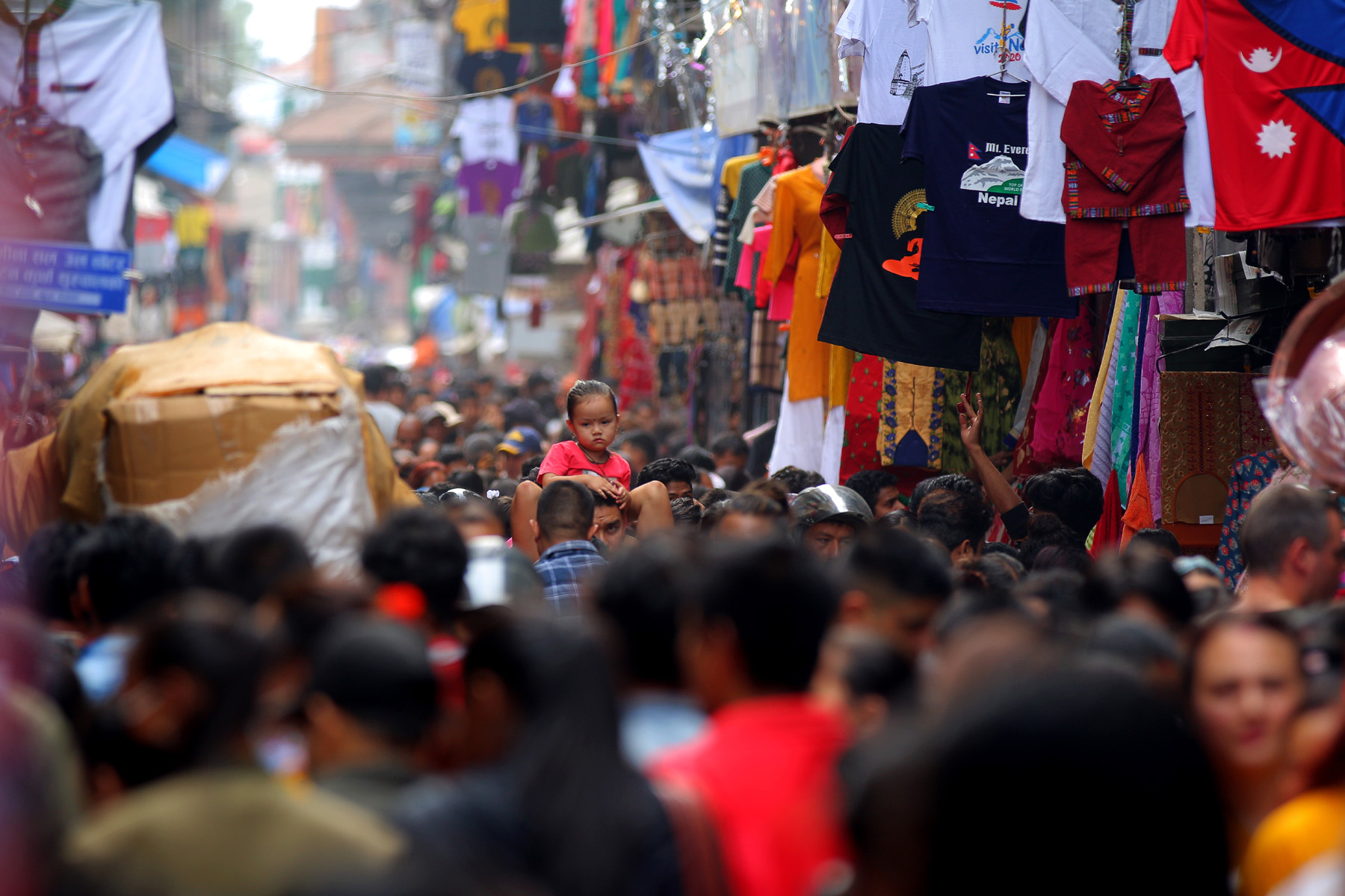 A man carries a child on his shoulders as shoppers throng Ason on Thursday. Amid festive fervour, major marketplaces in Kathmandu are crowded, creating jams on busy road sections. Elite Joshi/TKP