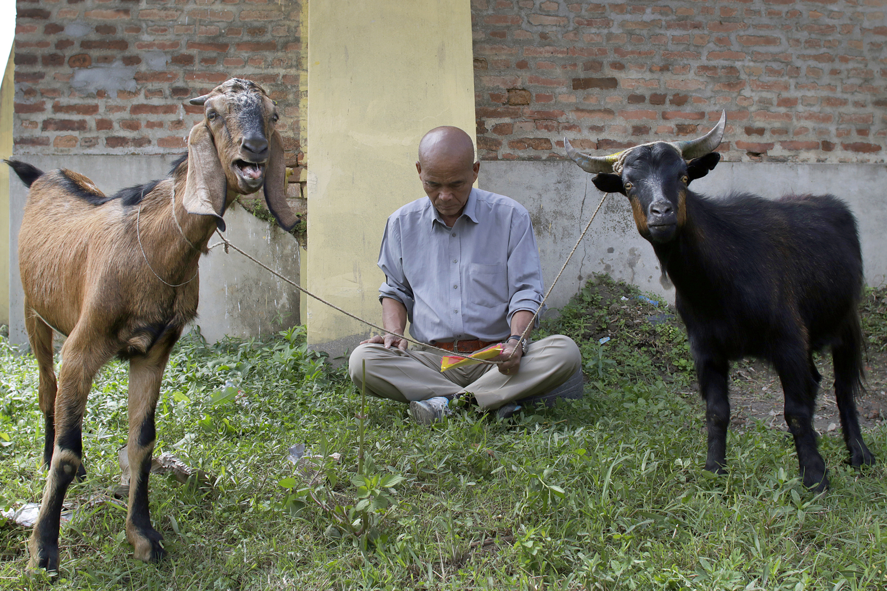 A person checks bills after purchasing goats for Dashain at Nepal Food Corporation in Thapathali, Kathmandu on Tuesday. The corporation plans to supply around 3,000 goats and mountain goats in the Capital for the festival. Anish Regmi/TKP