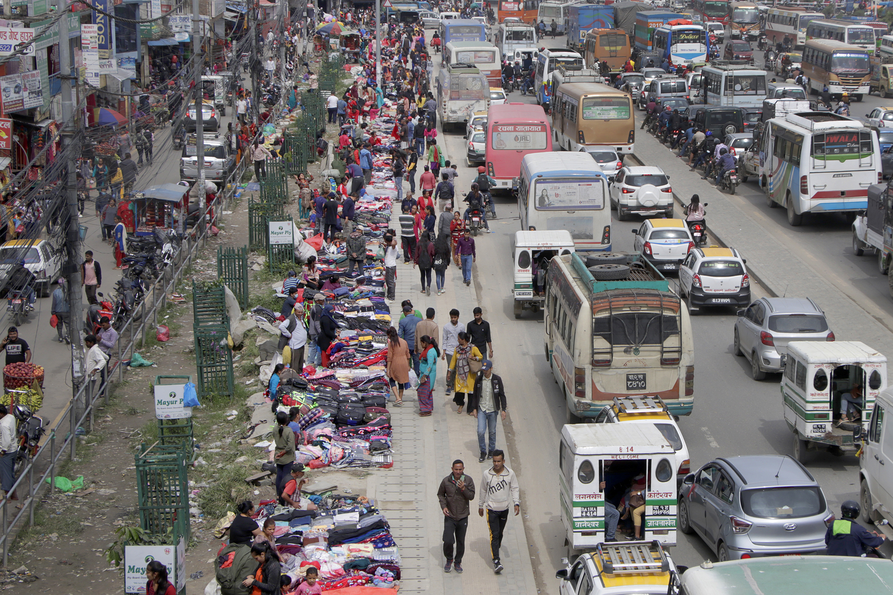Vendors display their goods for sale on the footpath at Koteshwor in Kathmandu on Saturday. Sights like this are common across the Capital. Anish Regmi/TKP