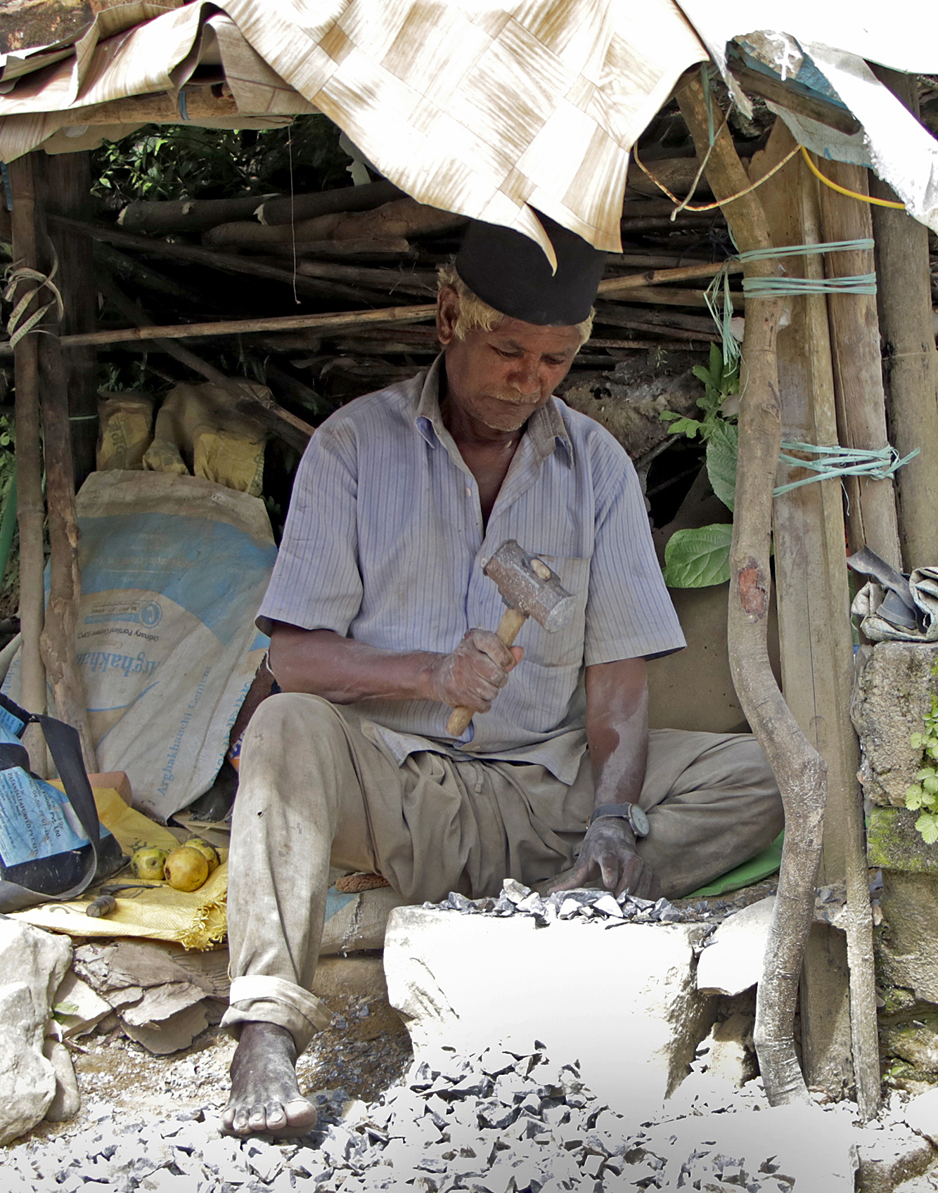 Shantamaan Shrestha of Teenghare, Raniban, crushes stones into pebbles at Icchangu in Kathmandu on Wednesday. He has been engaged in this profession for around 10 years. Anish Regmi/TKP