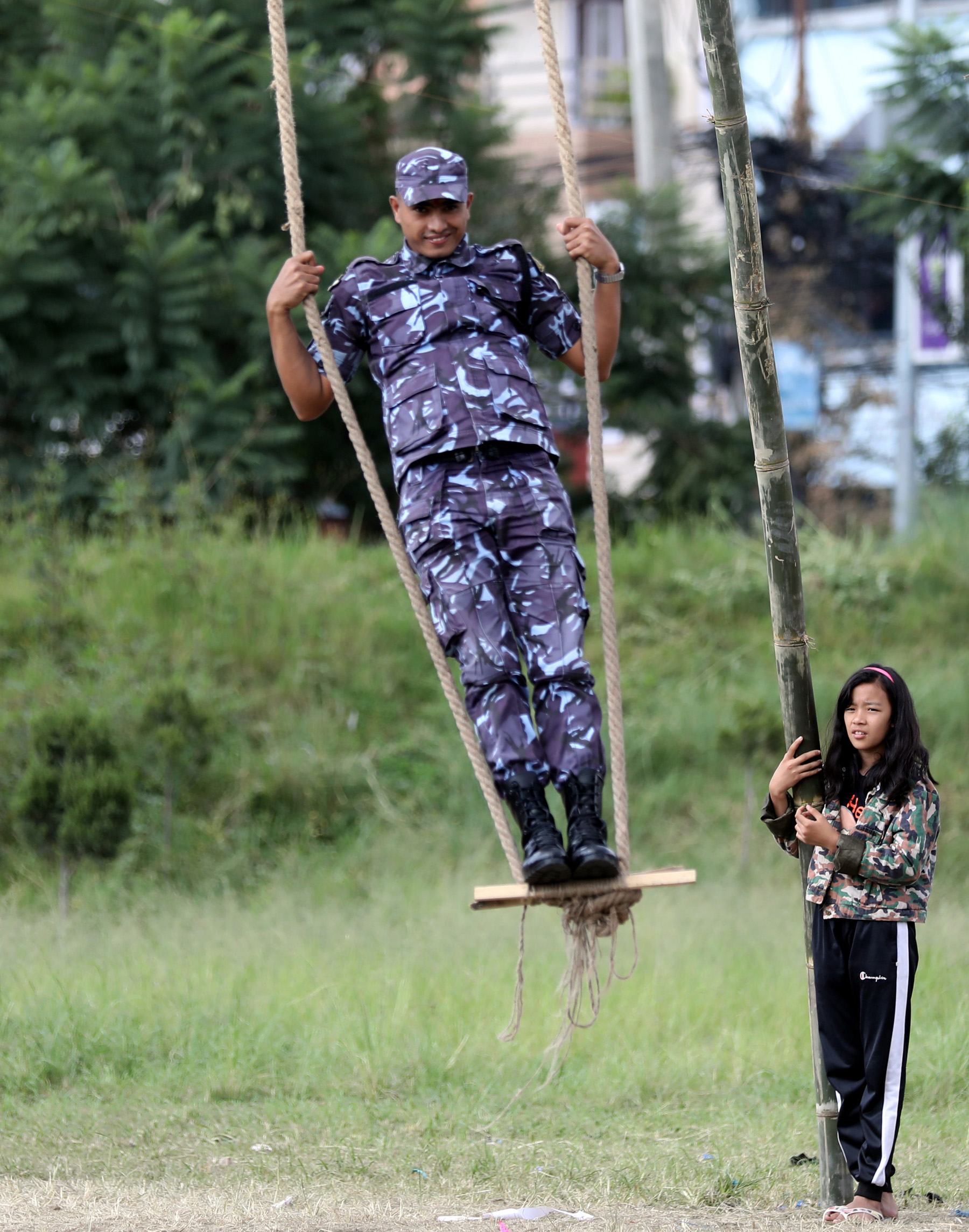 A Nepal Police officer plays on a traditional swing in Narayanchaur, Naxal, on Friday. Elite Joshi/TKP