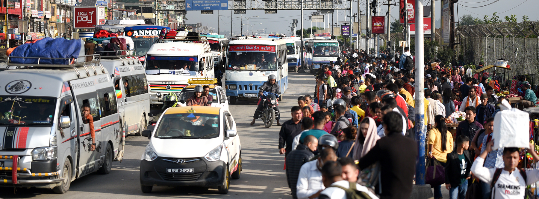 People travelling to their hometowns for Dashain wait for vehicles in Koteshwor, Kathmandu, on Friday. More than three million people are expected to leave the Kathmandu Valley for the festival this year. Angad Dhakal/TKP