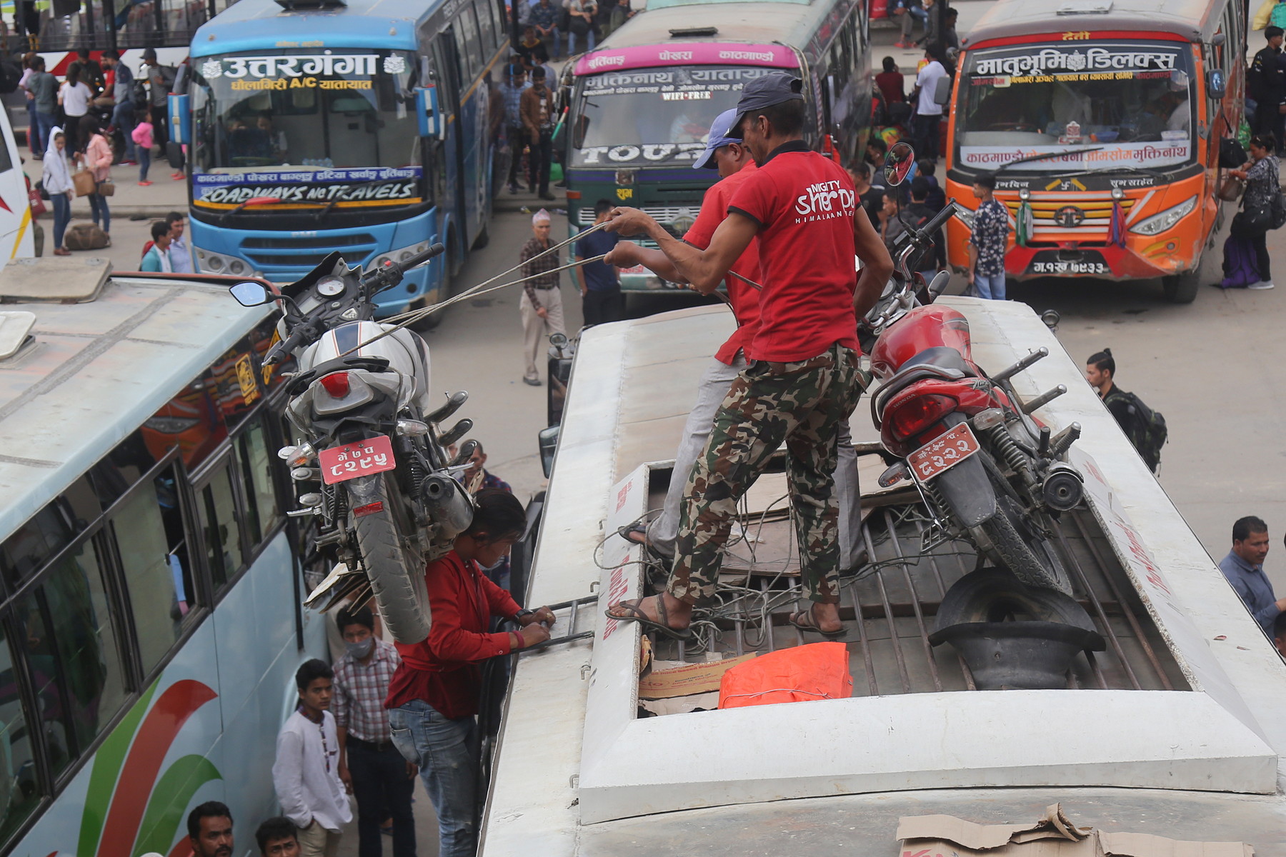Workers load motorcycles on a bus bound for Rukum in Kathmandu. They charge anywhere between Rs 1,000 and Rs 1,500 to put a motorcycle atop a bus. Kabin Adhikari/TKP