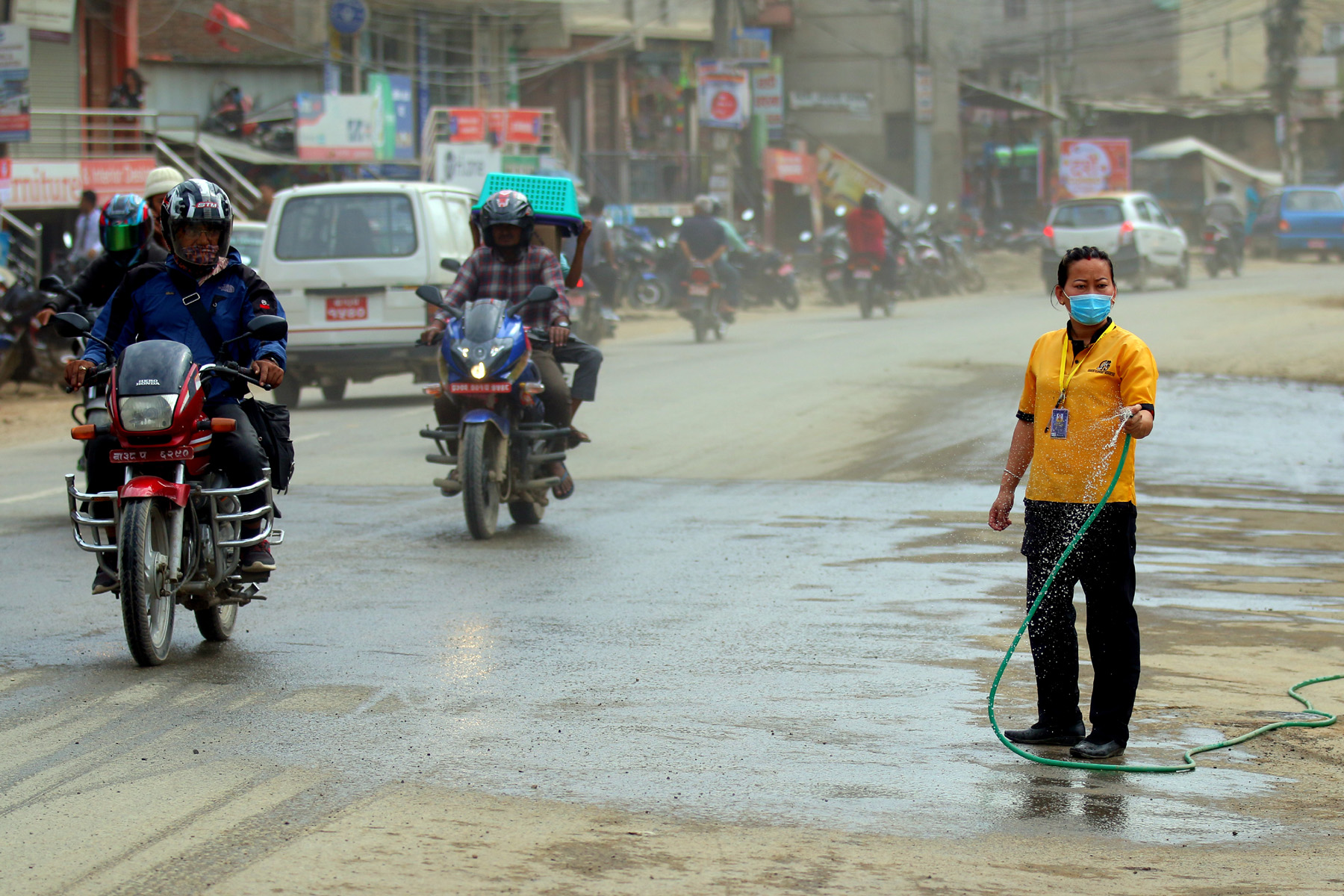 A woman sprinkles water on a dusty road section in Nakkhu, Lalitpur, on Wednesday. Elite Joshi/TKP