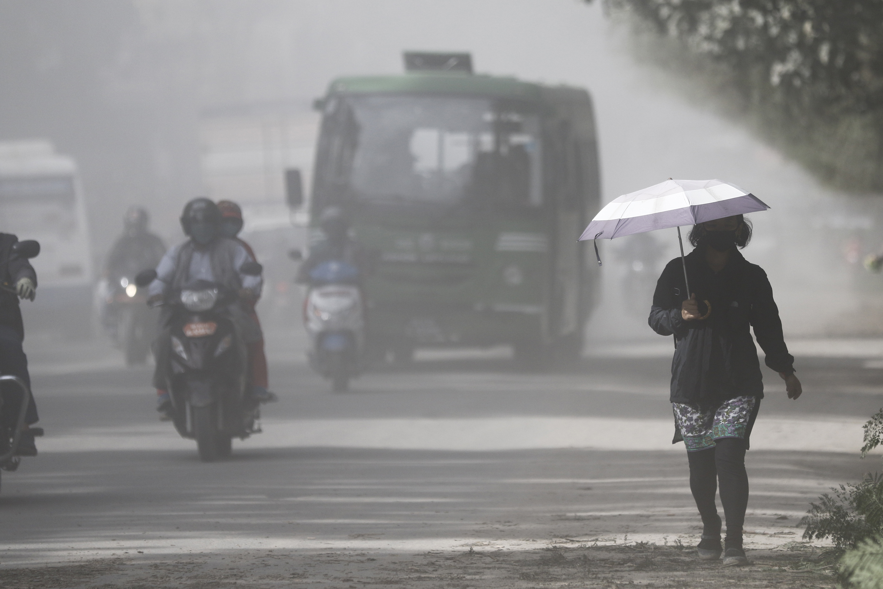 A masked pedestrian walks along a dusty road section in Bafal, Kathmandu, on Sunday. Keshav Thapa/TKP