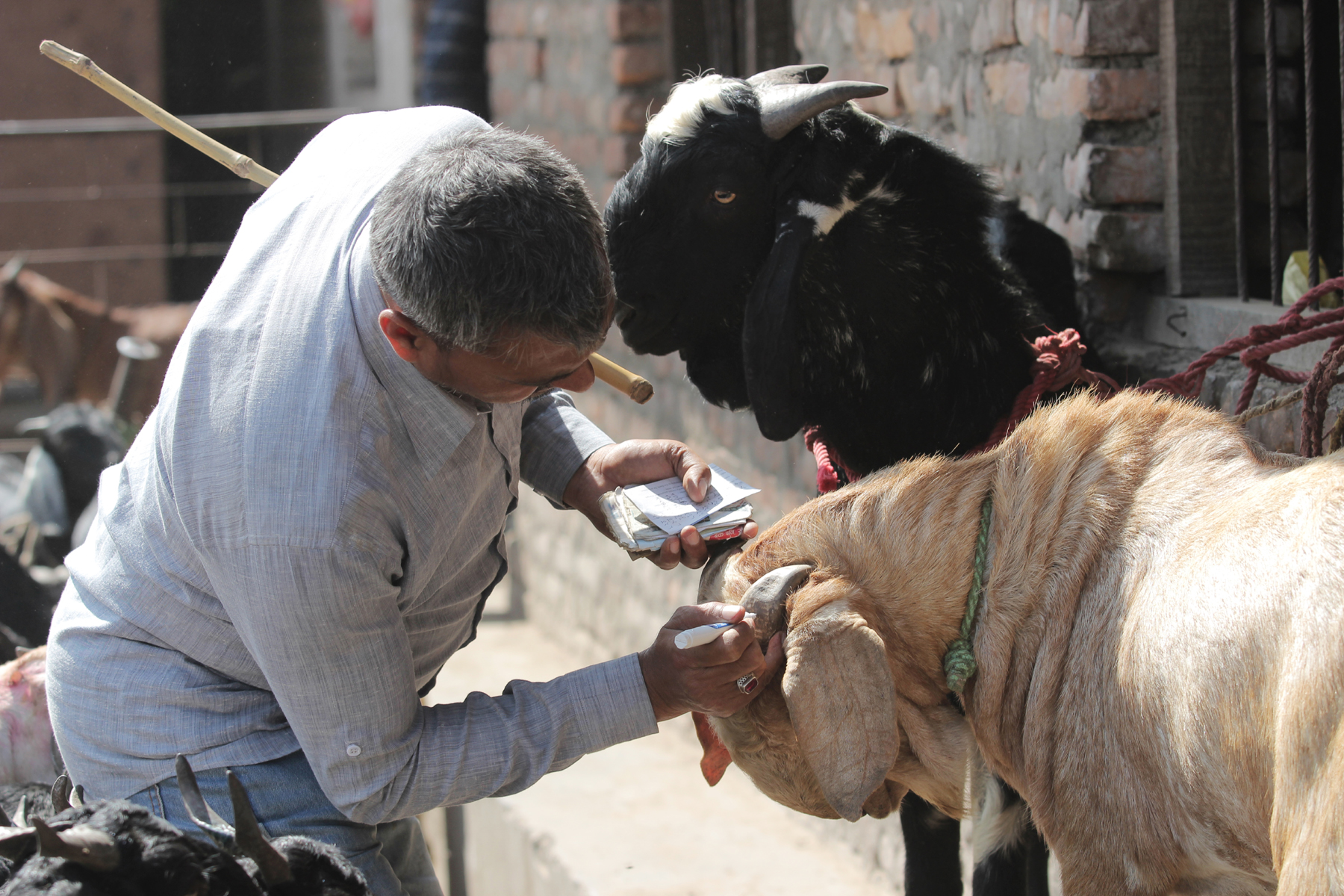 A trader marks a goat with colour at a livestock market in Kalanki, Kathmandu on Monday. Kabin Adhikari/TKP