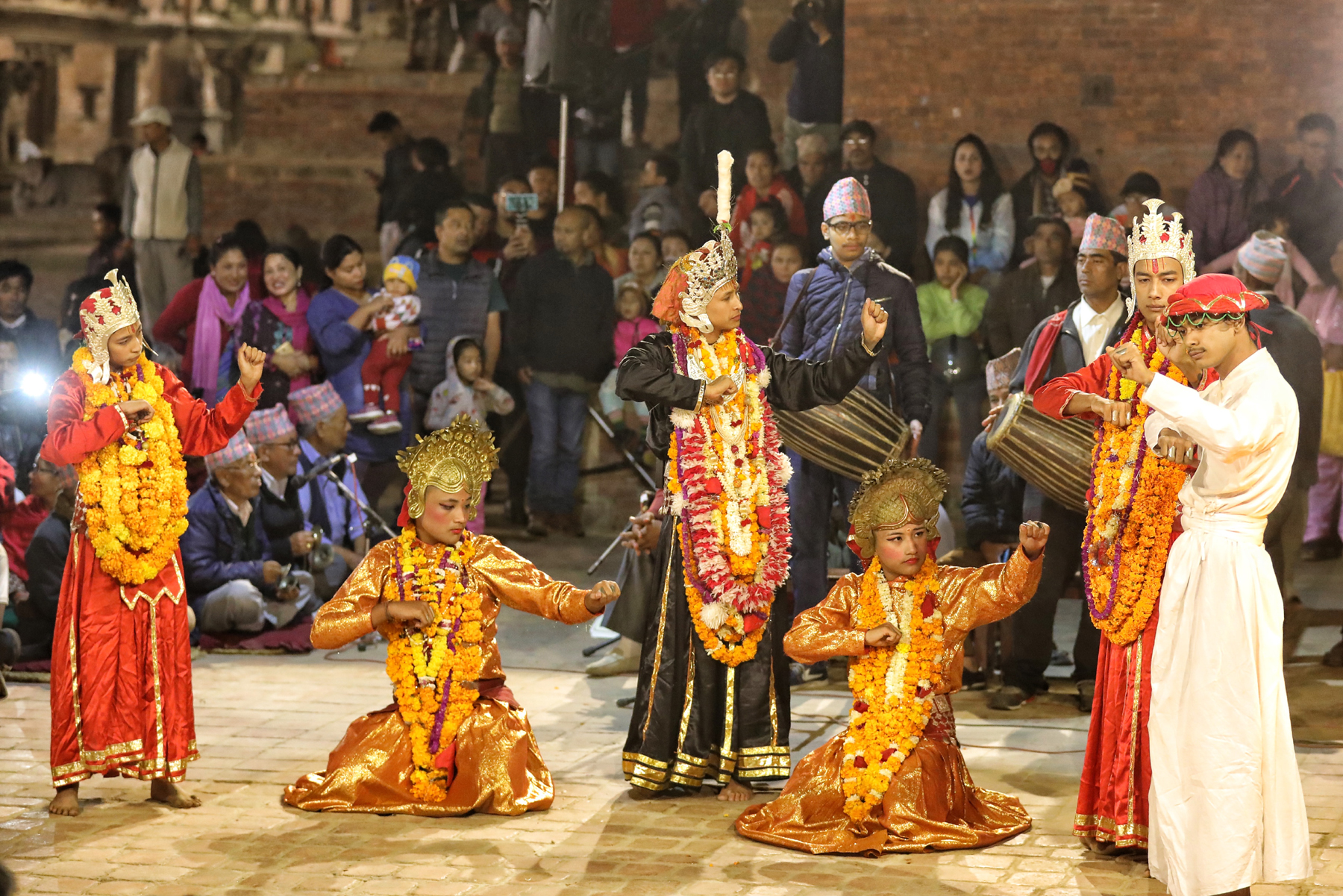 A group of dancers perform Kartik Naach at Mangal Bazar in Lalitpur. The traditional dance, which lasts for 12 days, started on Friday. Elite Joshi/TKP