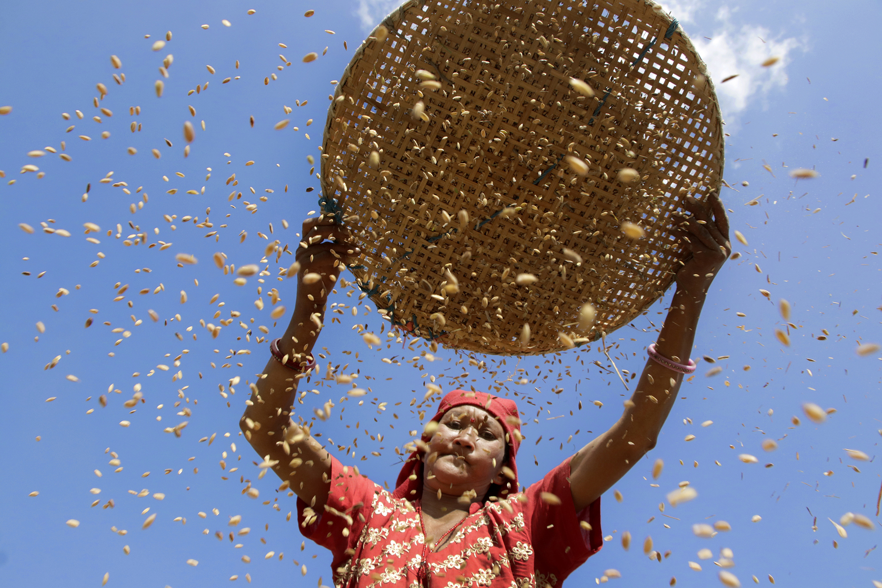 A farmer winnows rice to remove husk during harvest in Sikali, Lalitpur on Thursday. Anish Regmi/TKP