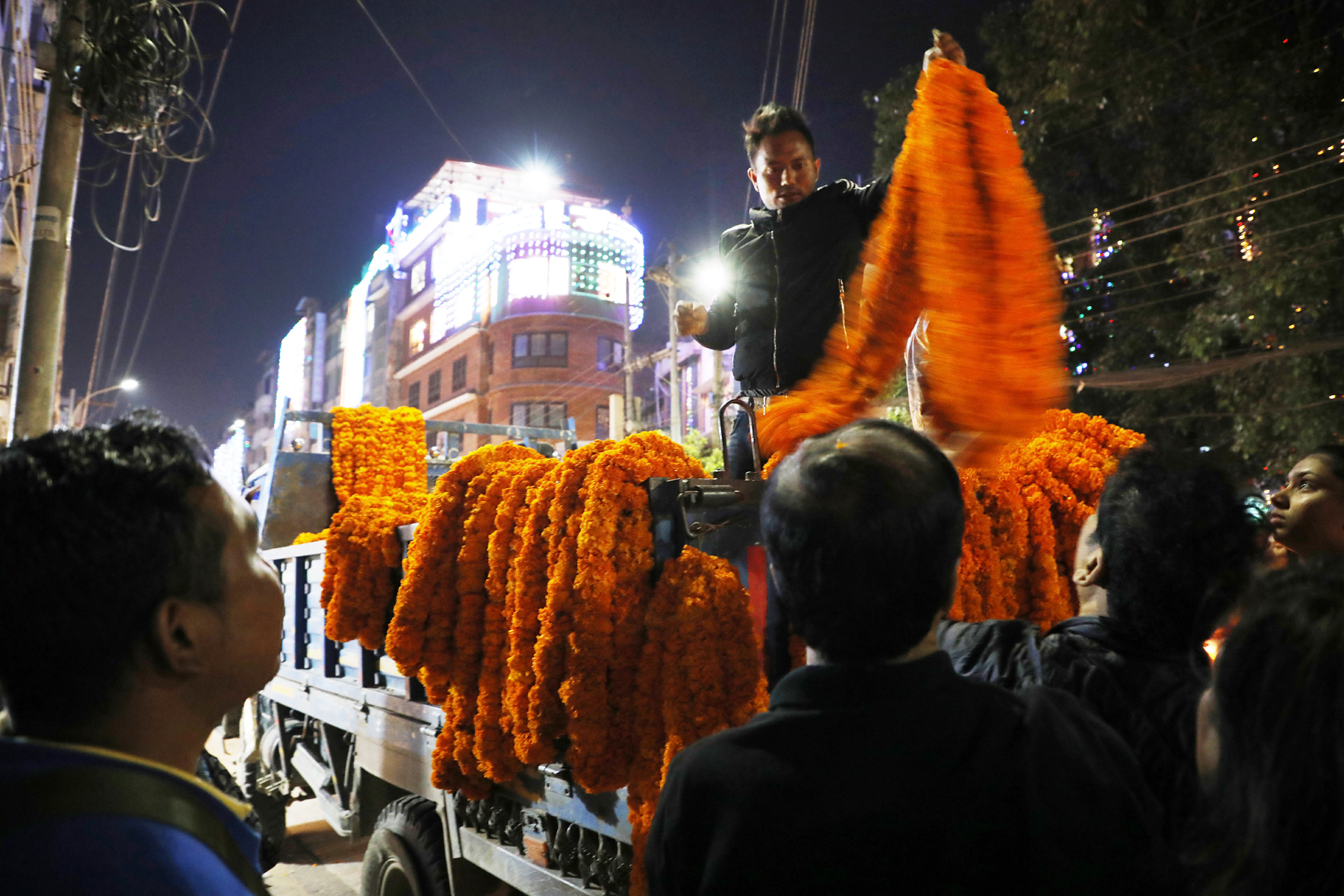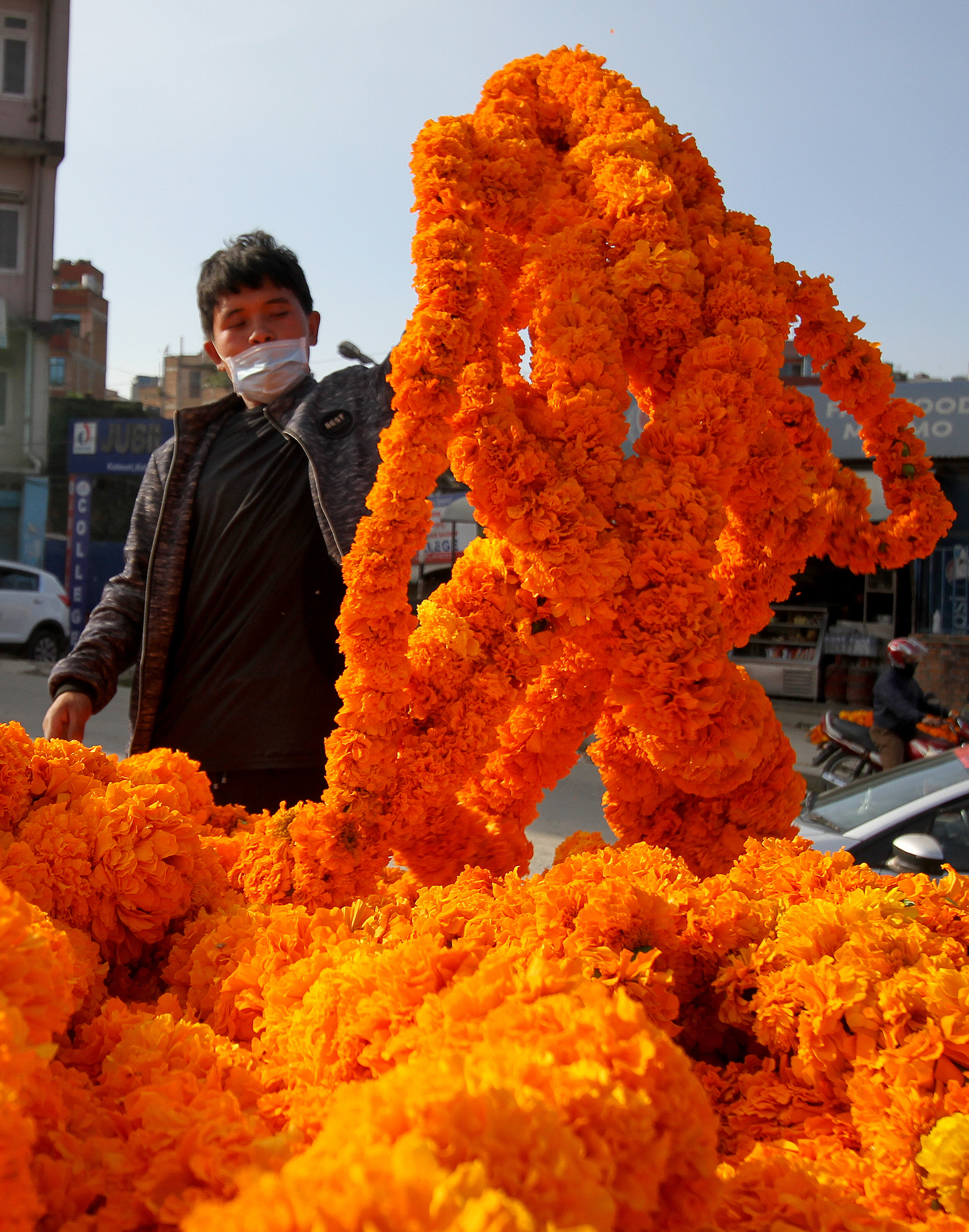 A vendor sells marigold flowers for Tihar in Kathmandu, on Saturday. Sanjog Manandhar/TKP