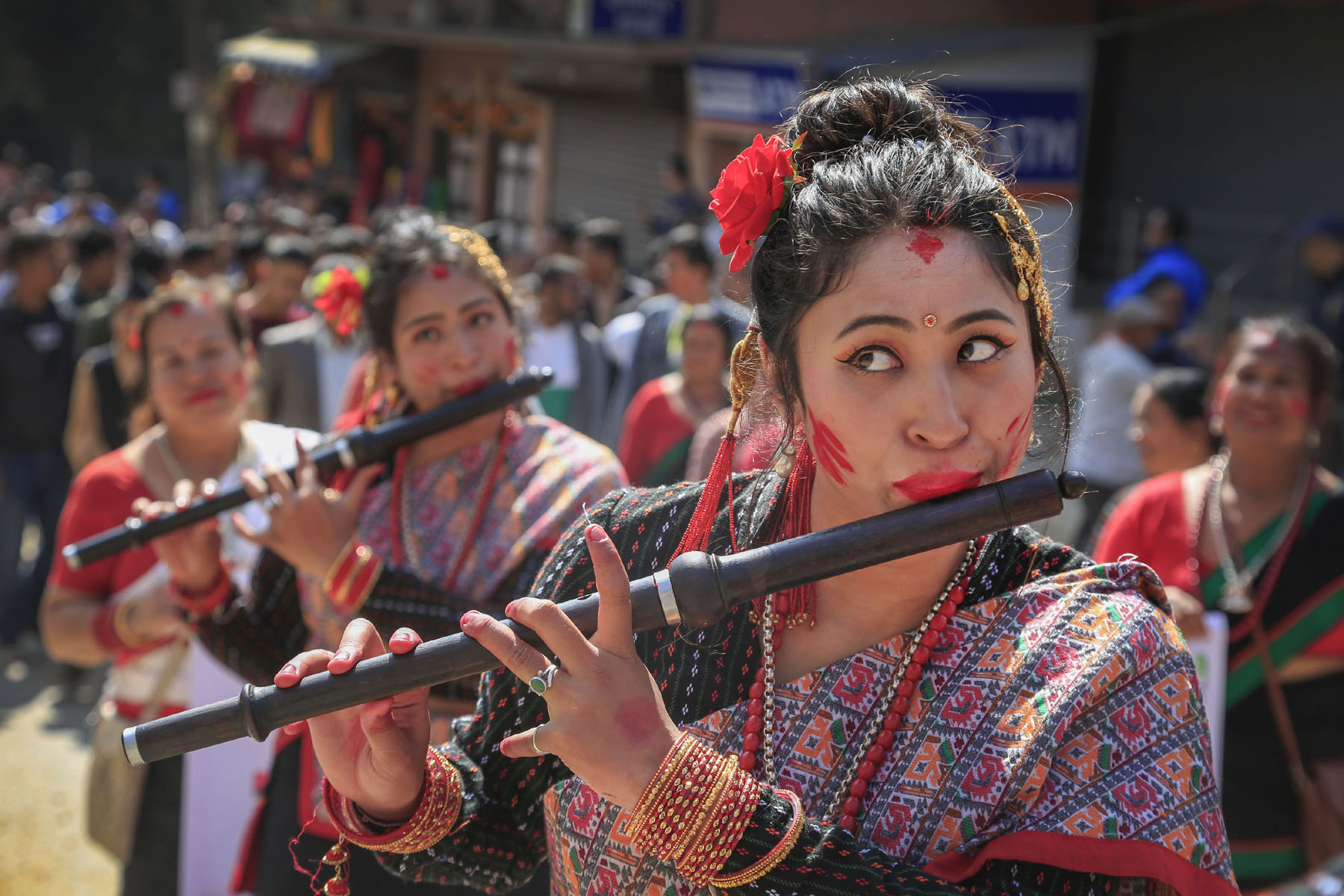 Women from Newar community play the flute at a rally organised on the occasion of Nepal Sambat 1140 in Kirtipur, Kathmandu on Tuesday. Prakash Chandra Timilsena /TKP