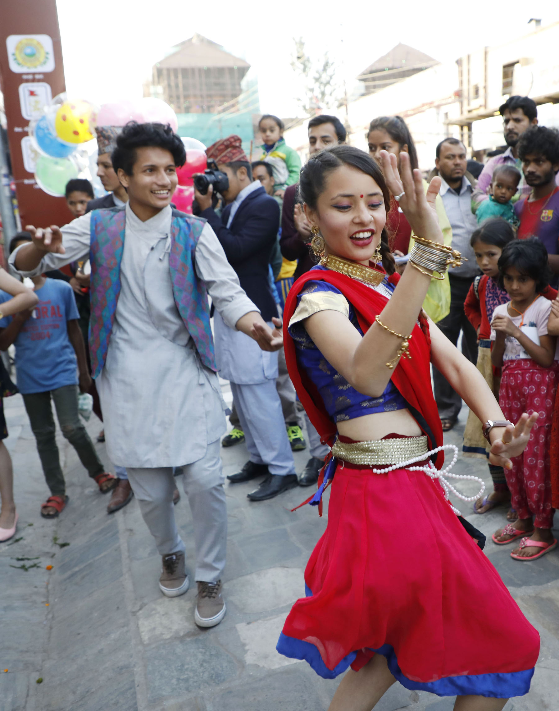 A girl and a boy perform a dance item during a Tihar Deusi Bhailo programme in Kathmandu. Sanjog Manandhar/TKP