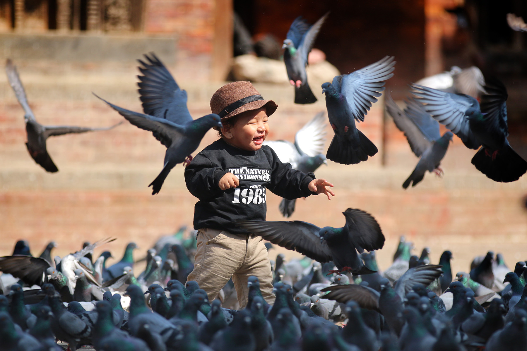 A child gets excited as he totters among a flock of pigeons at the Hanumandhoka Durbar Square in Kathmandu on Friday. Elite Joshi/TKP