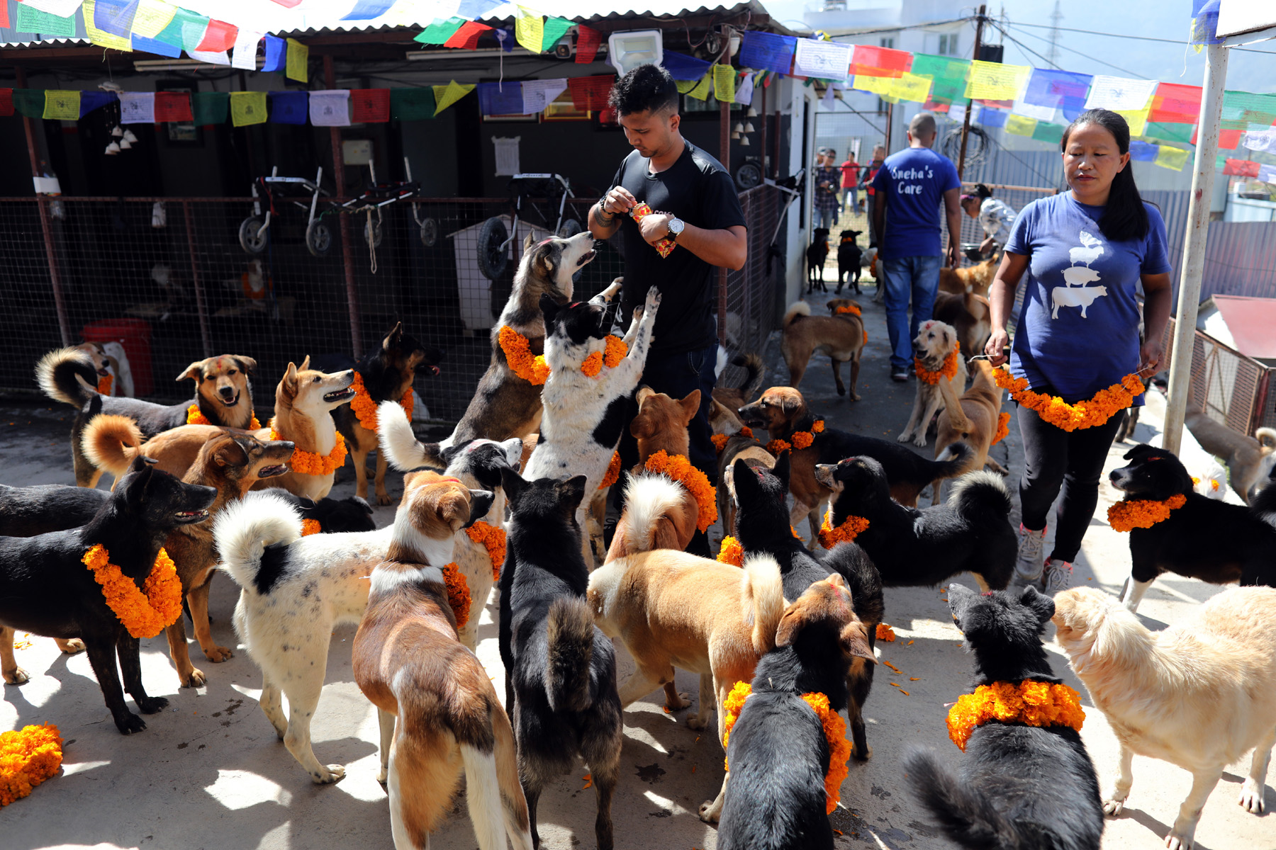 Sneha’s Care Centre, which was established for providing protection for stray dogs, celebrates Kukur Tihar, in the Capital on Sunday. Elite Joshi/TKP