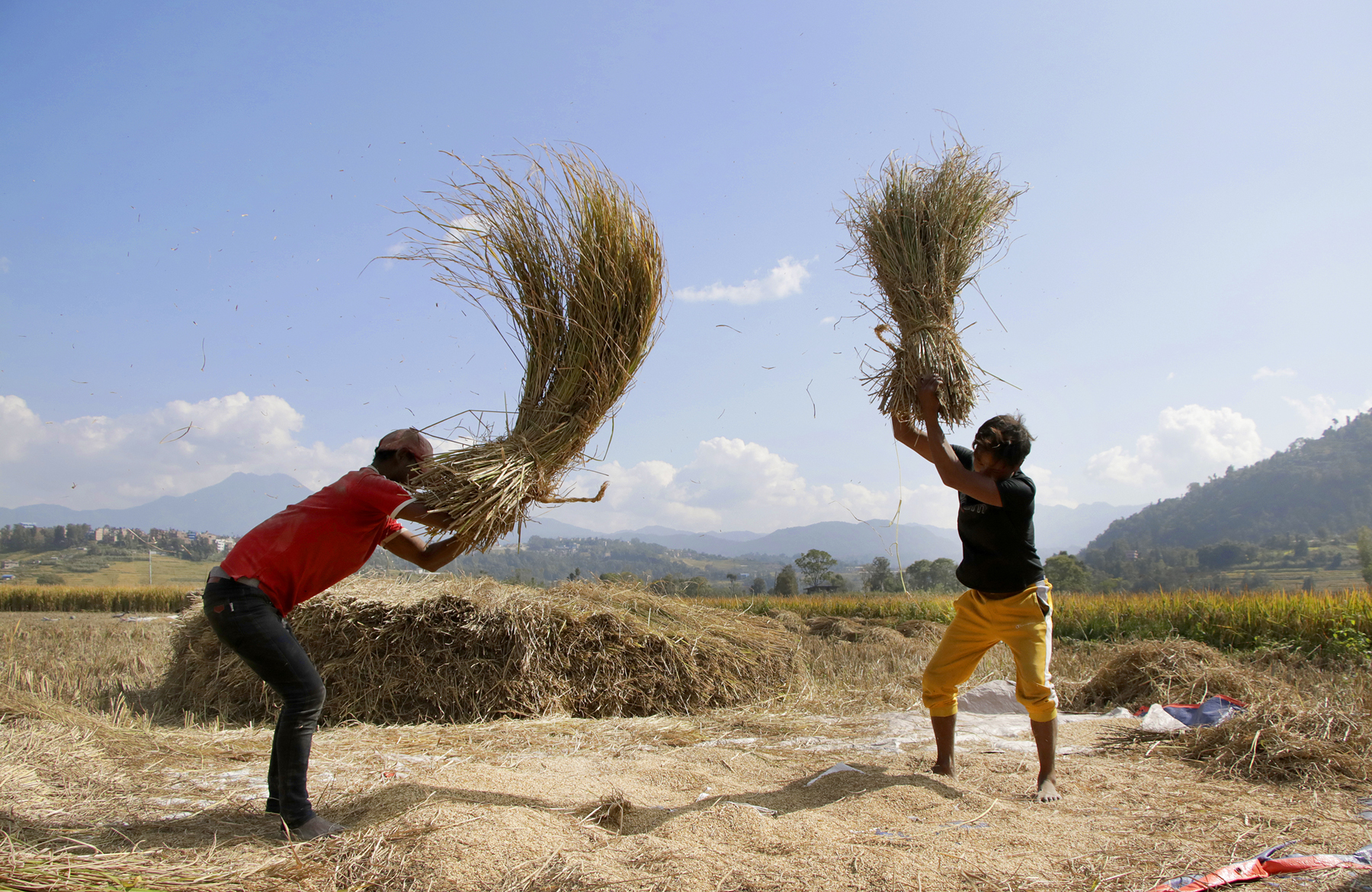 Farmers harvest rice at a field in Sikali, Lalitpur on Thursday. Anish Regmi/TKP