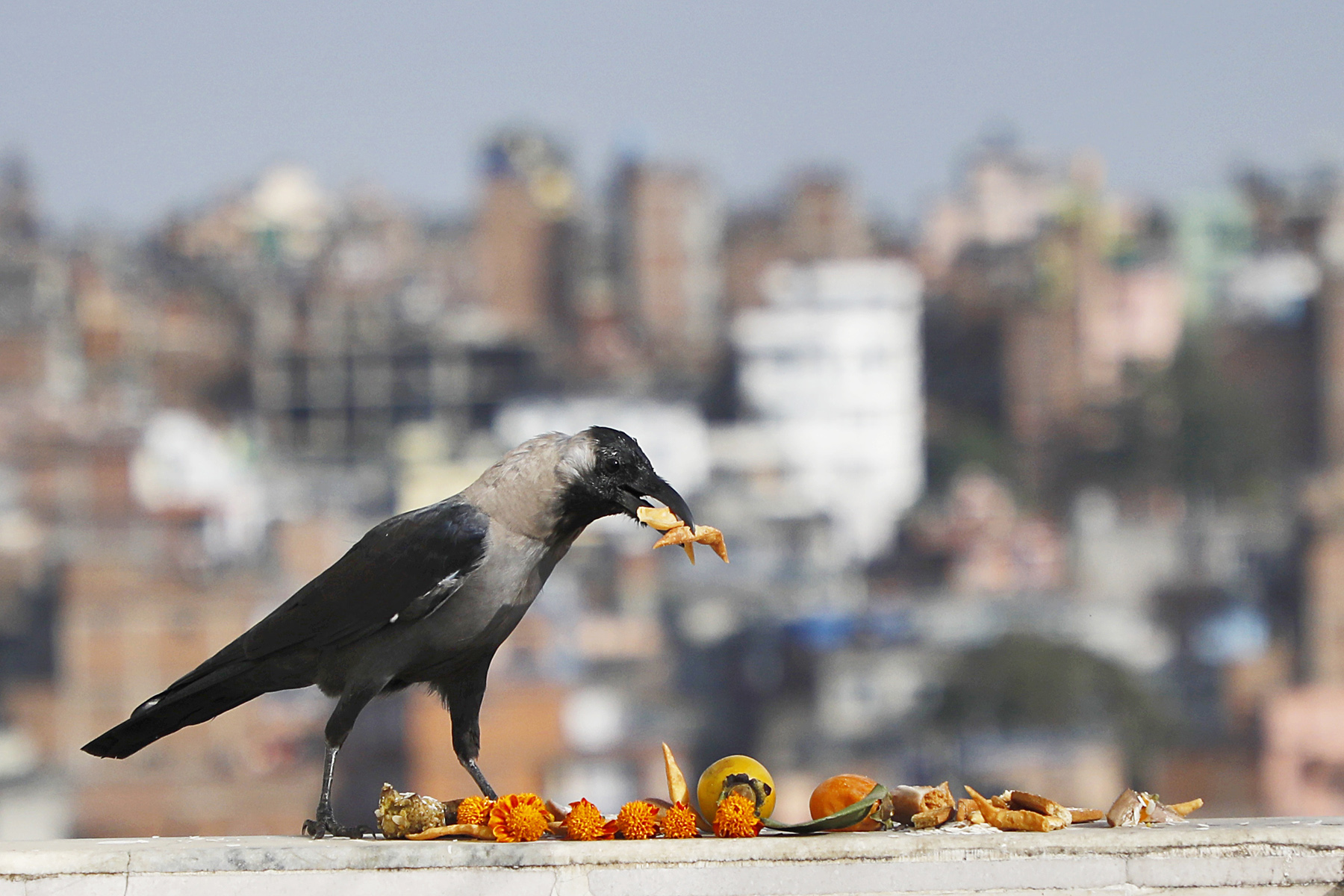 A crow eats offerings made by devotees on Kag Tihar, in Kathmandu on Saturday. Sanjog Manandhar/TKP