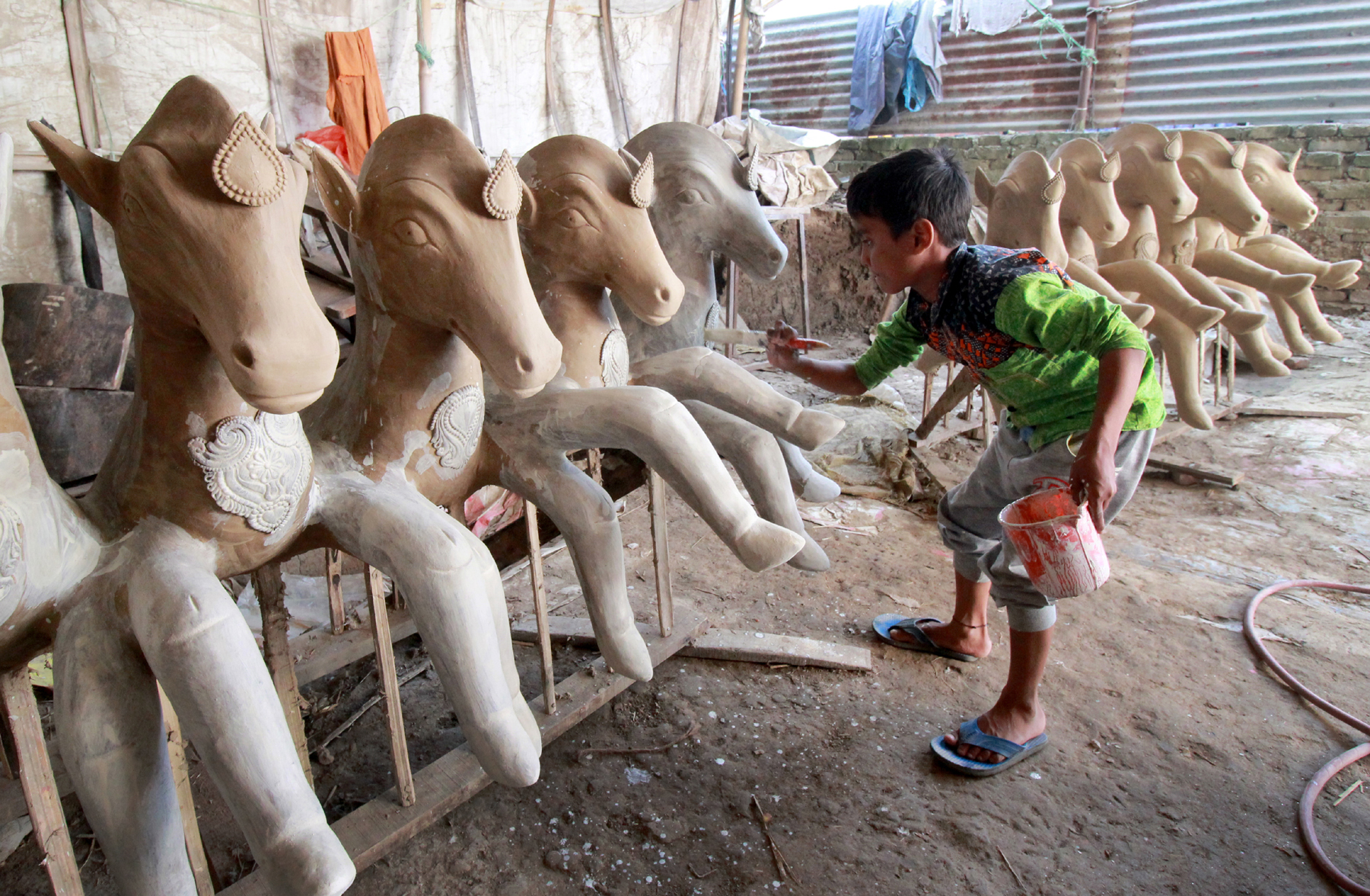 Seven-year-old Sajawar Rehman paints a sculpture near Gusingal, in Lalitpur. Beeju Maharjan/TKP