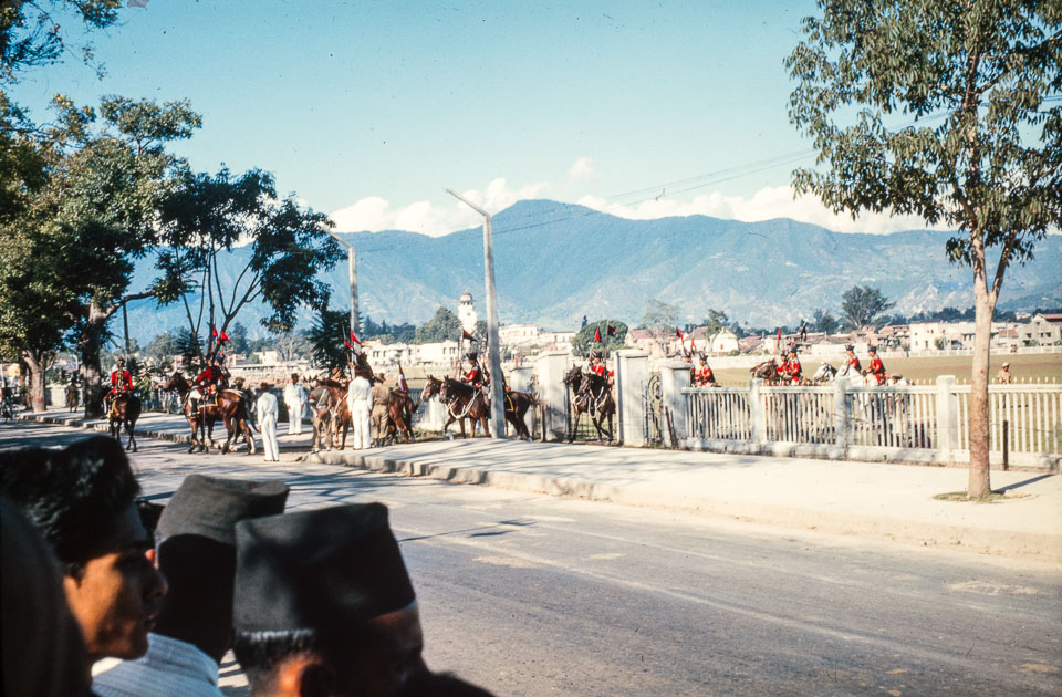 Mounted royal guard exiting Tundikhel circa 1962-1963. Nepal Photo History Project/Peace Corp