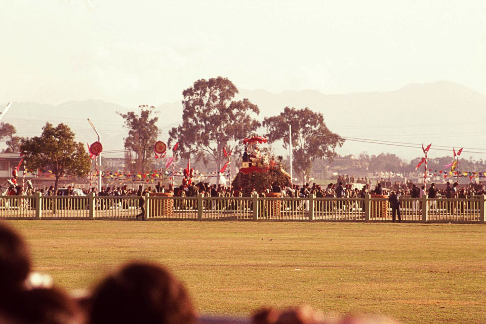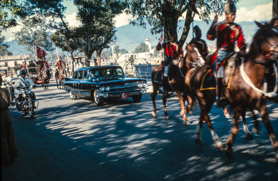 King Mahendra, flanked by the royal mounted guard, arrives in a Cadillac at Tundikhel circa 1962-1963. Nepal Photo History Project/Peace Corp