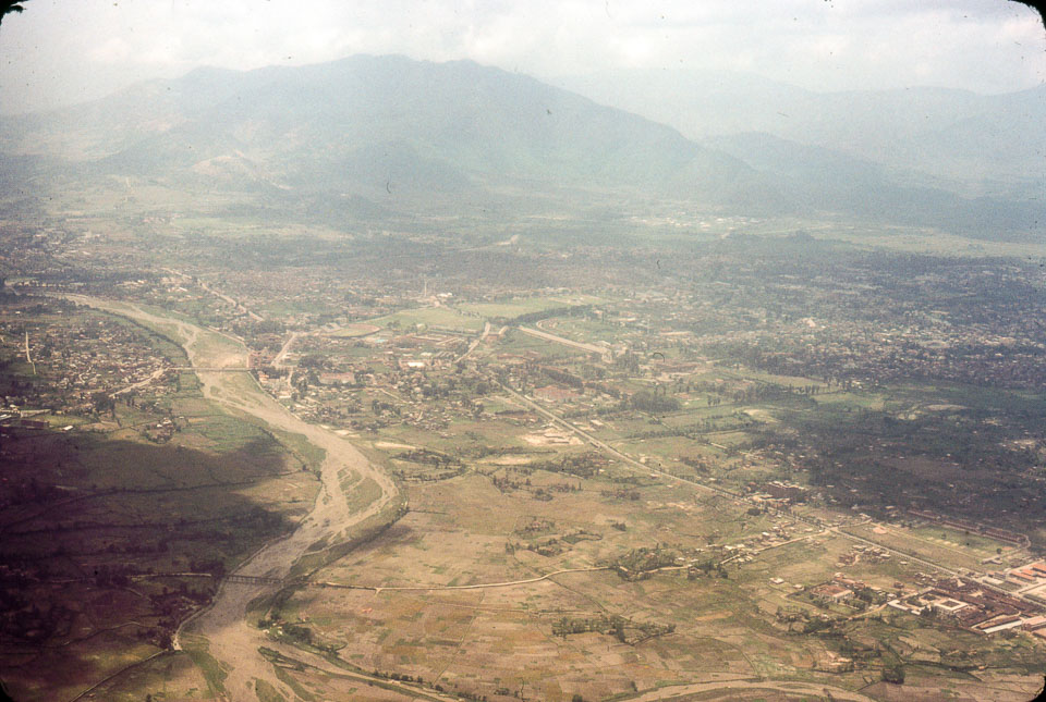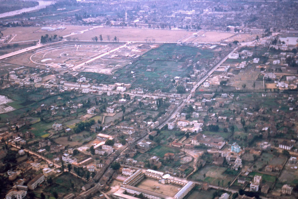 This view looks westward to the city centre of Kathmandu in 1966. Rani Pokhari is at the top right while the Bagmati river is in the top left. The open space of Tundikhel is at the top-centre with the Bhimsen Tower (Dharahara) just beyond it. Nepal Photo History Project/Peace Corp