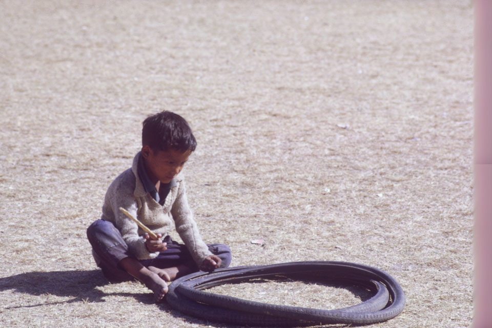 A young boy rests after rolling two bike tires on Tundikhel in 1968. Nepal Photo History Project/Peace Corp