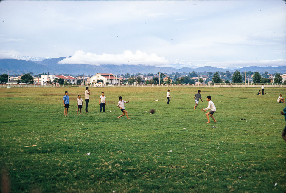 Children play football in Tundikhel in 1970. Nepal Photo History Project/Peace Corp