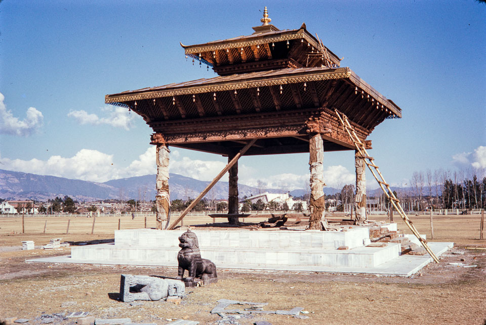 A ceremonial platform being constructed at Tundikhel for the coronation of King Birendra in 1975. Nepal Photo History Project/Peace Corp