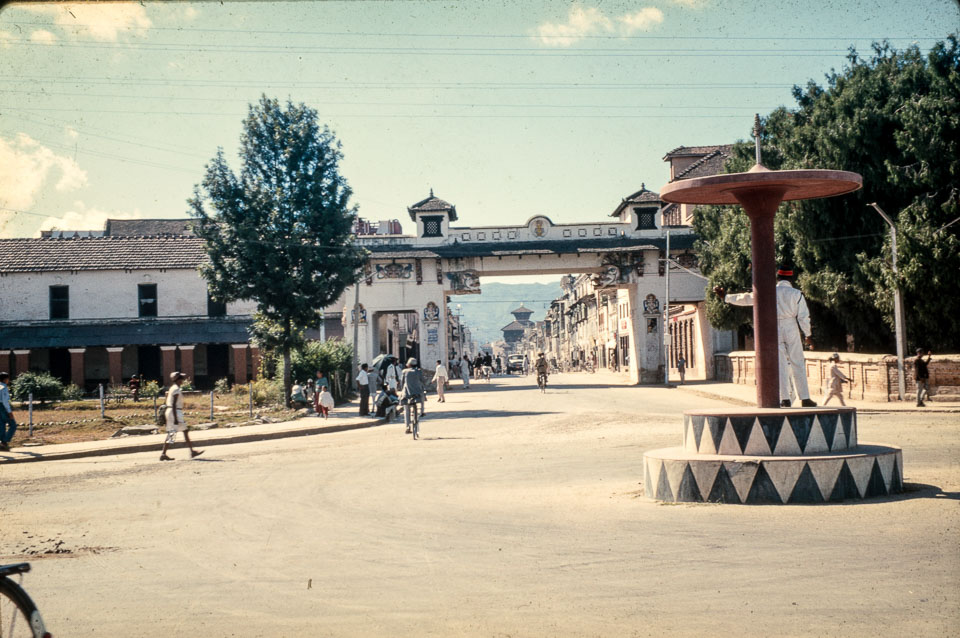 A police officer readies to direct traffic at the New Road gate, with a view of Basantapur circa 1962-1963. Nepal Photo History Project/Peace Corp