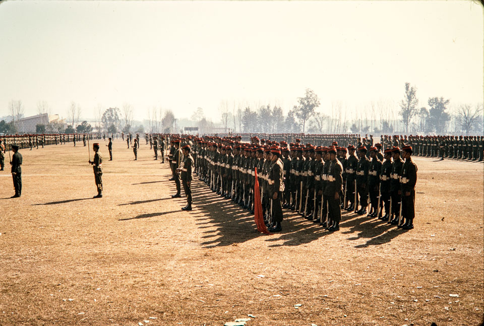 Soldiers practice at Tundikhel in preparation for the coronation of King Birendra. Nepal Photo History Project/Peace Corp