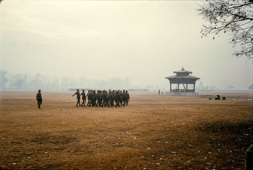 Soldiers practice at Tundikhel in the morning fog in preparation for the coronation of King Birendra. Nepal Photo History Project/Peace Corp