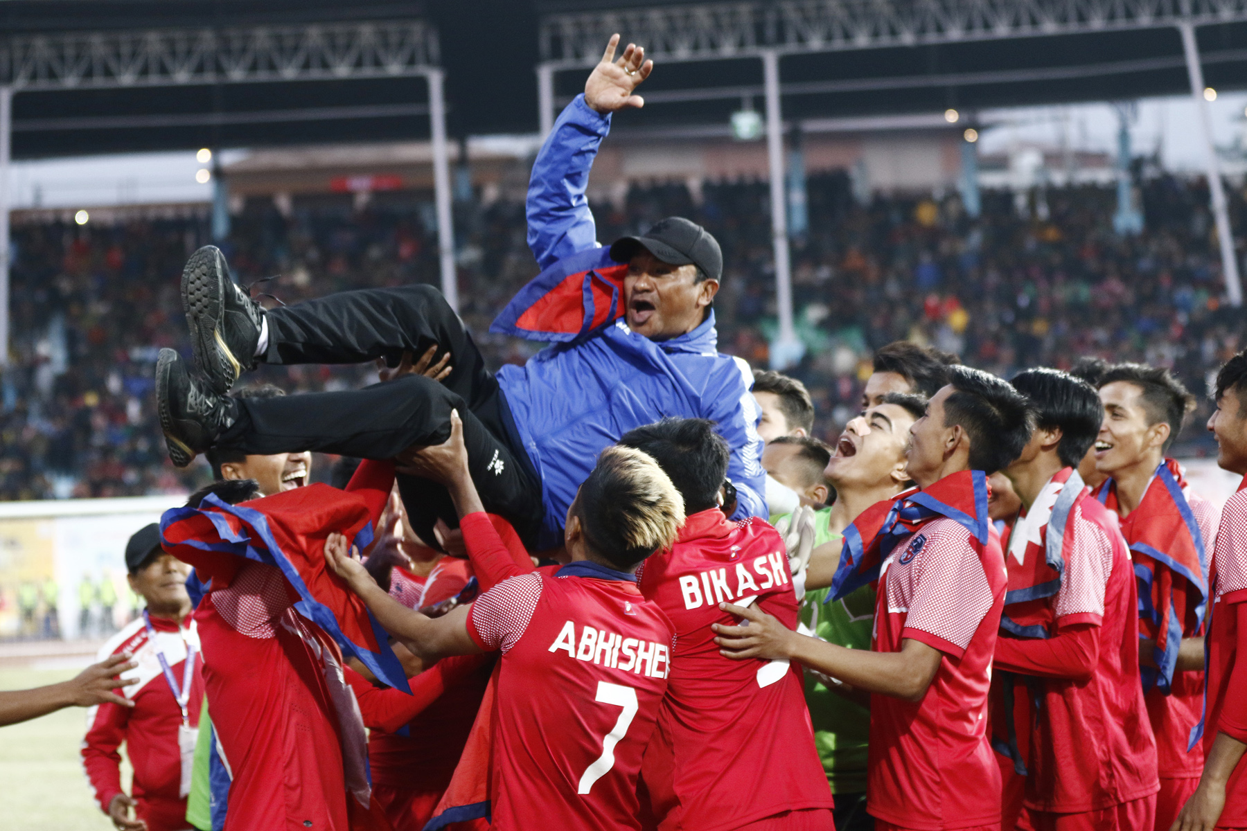 Nepal men’s U-23 team celebrate their hard-fought victory over Bhutan with head coach Bal Gopal Maharjan at the Dashrath Stadium in Kathmandu on Tuesday. Keshav Thapa/TKP