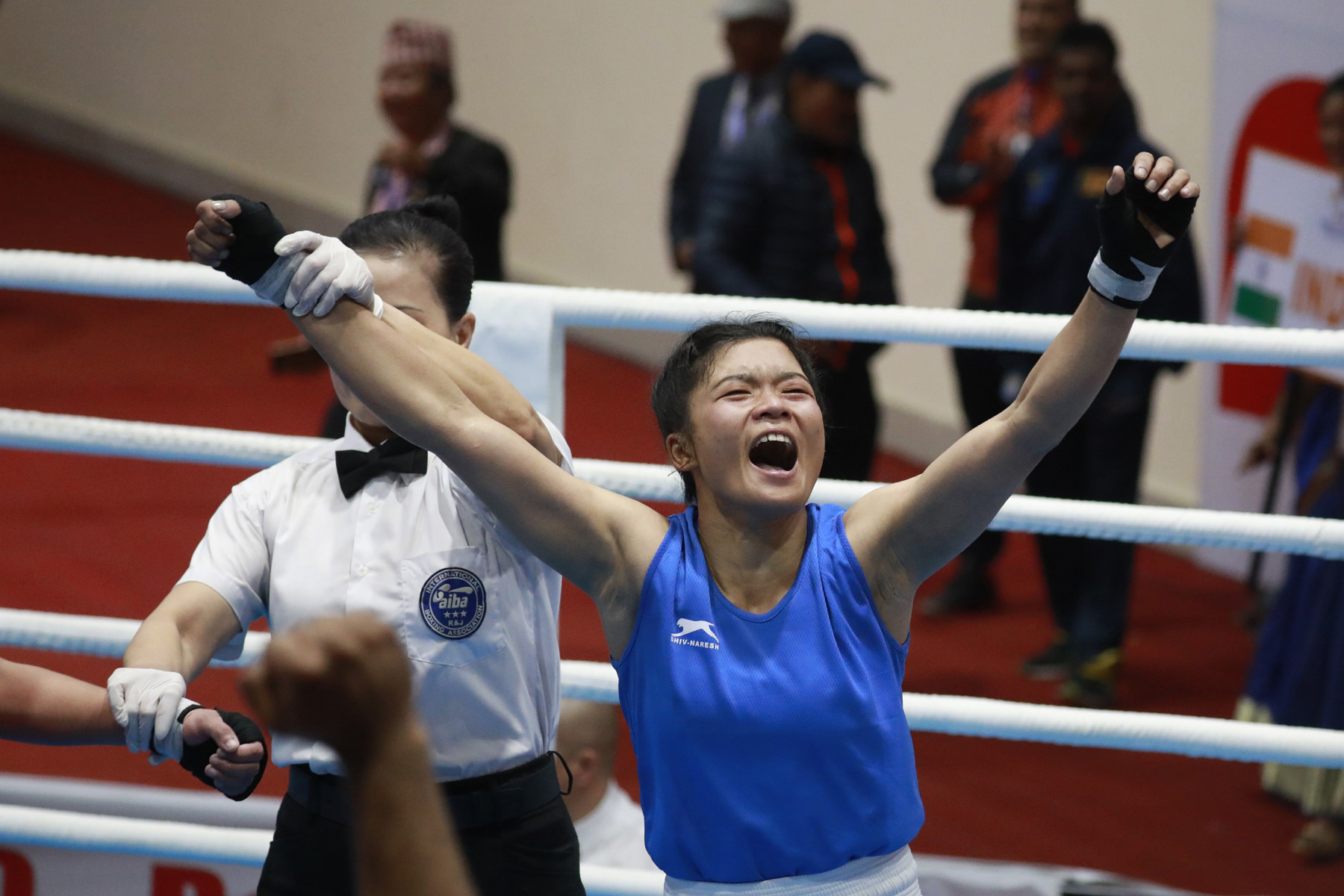 Nepali boxer Minu Gurung reacts after winning her bout against India’s Shiksha in the women’s 54kg category final at the South Asian Games, in Kathmandu on Monday. Hemanta Shrestha/TKP