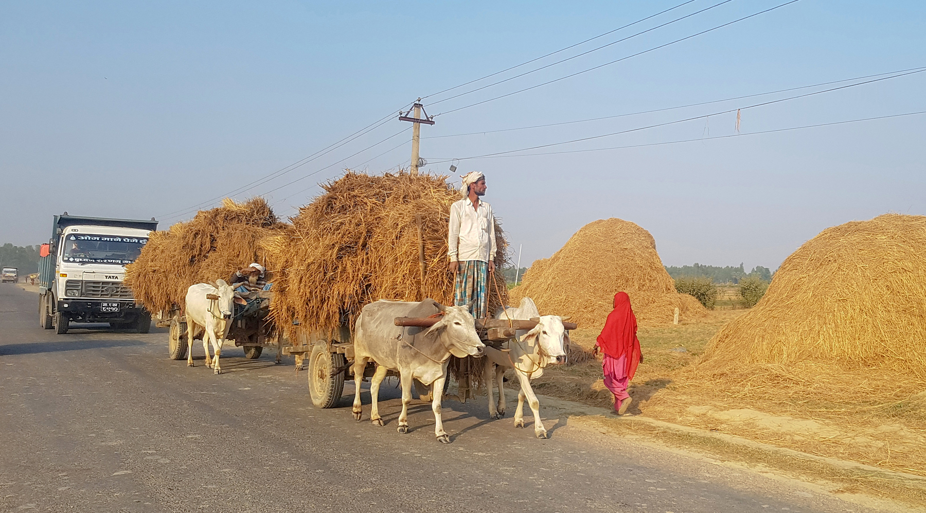 Farmers in Rautahat use bullock carts to transport hay. There are reports of a reduced paddy output in the district this year. Shiva Puri/TKP