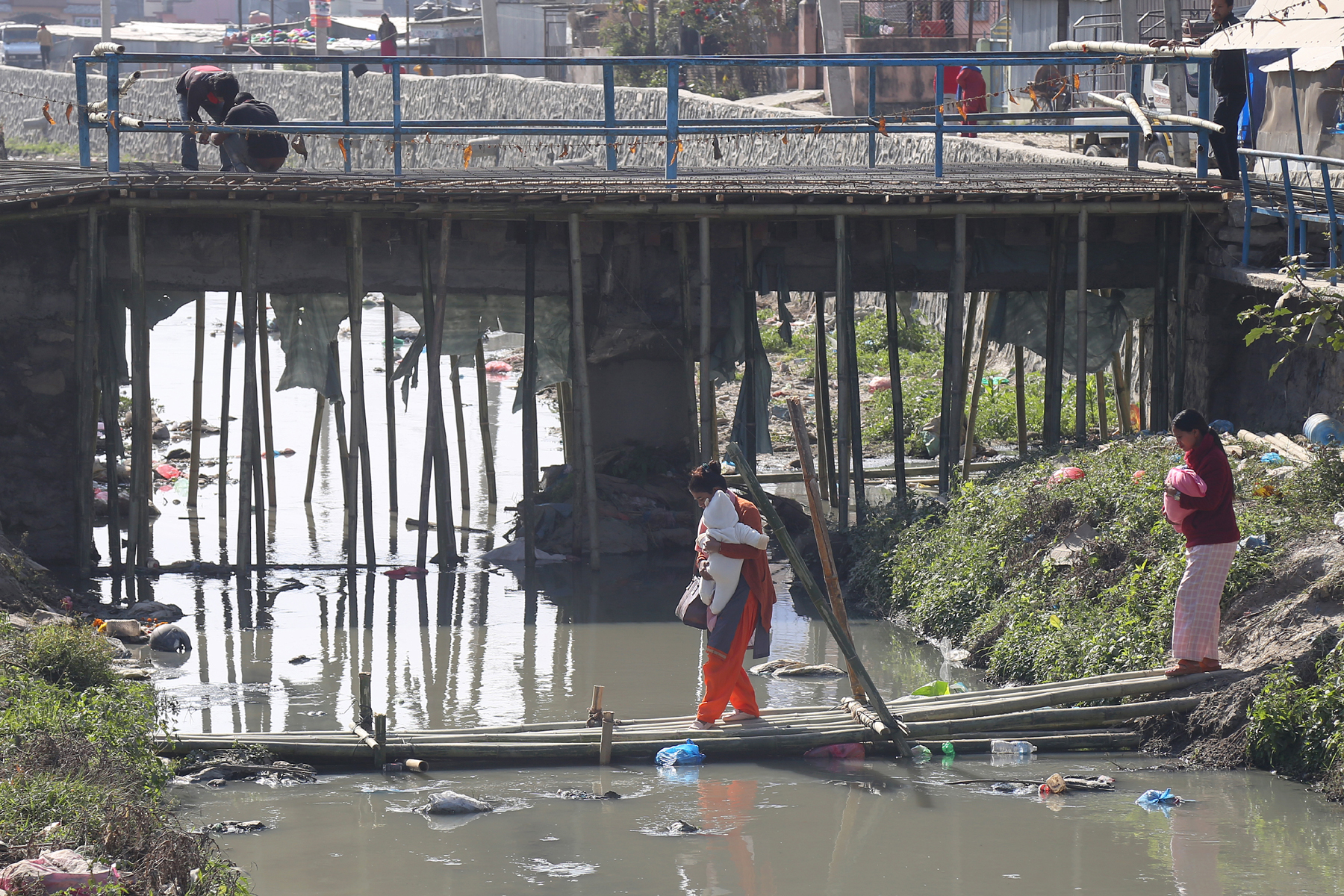 Women carrying children cross the Bishnumati river precariously through a temporary structure next to an under-construction bridge at Gongabu in Kathmandu. Kabin Adhikari/TKP