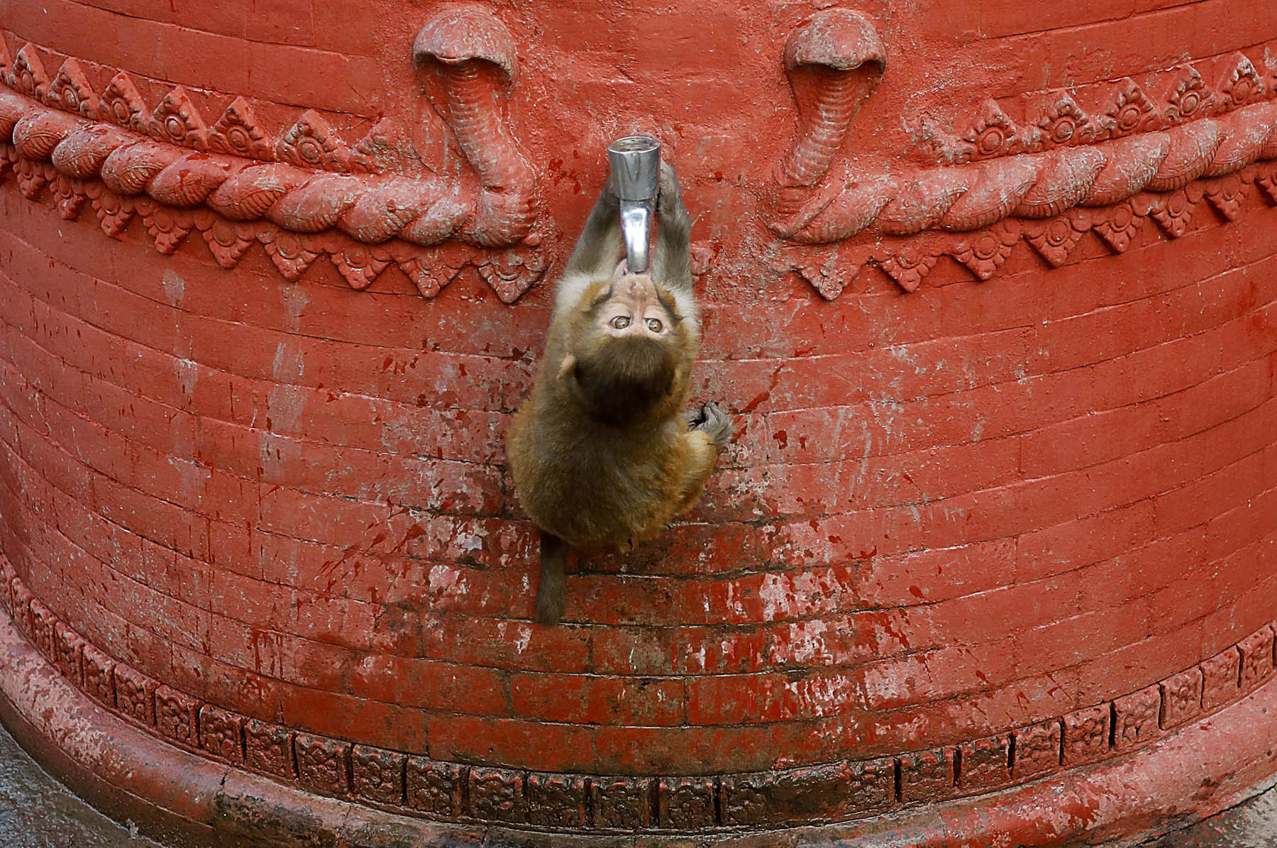 A monkey tries to drink water from a tap at Swayambu Stupa in the Capital. Sanjog Manandhar/TKP