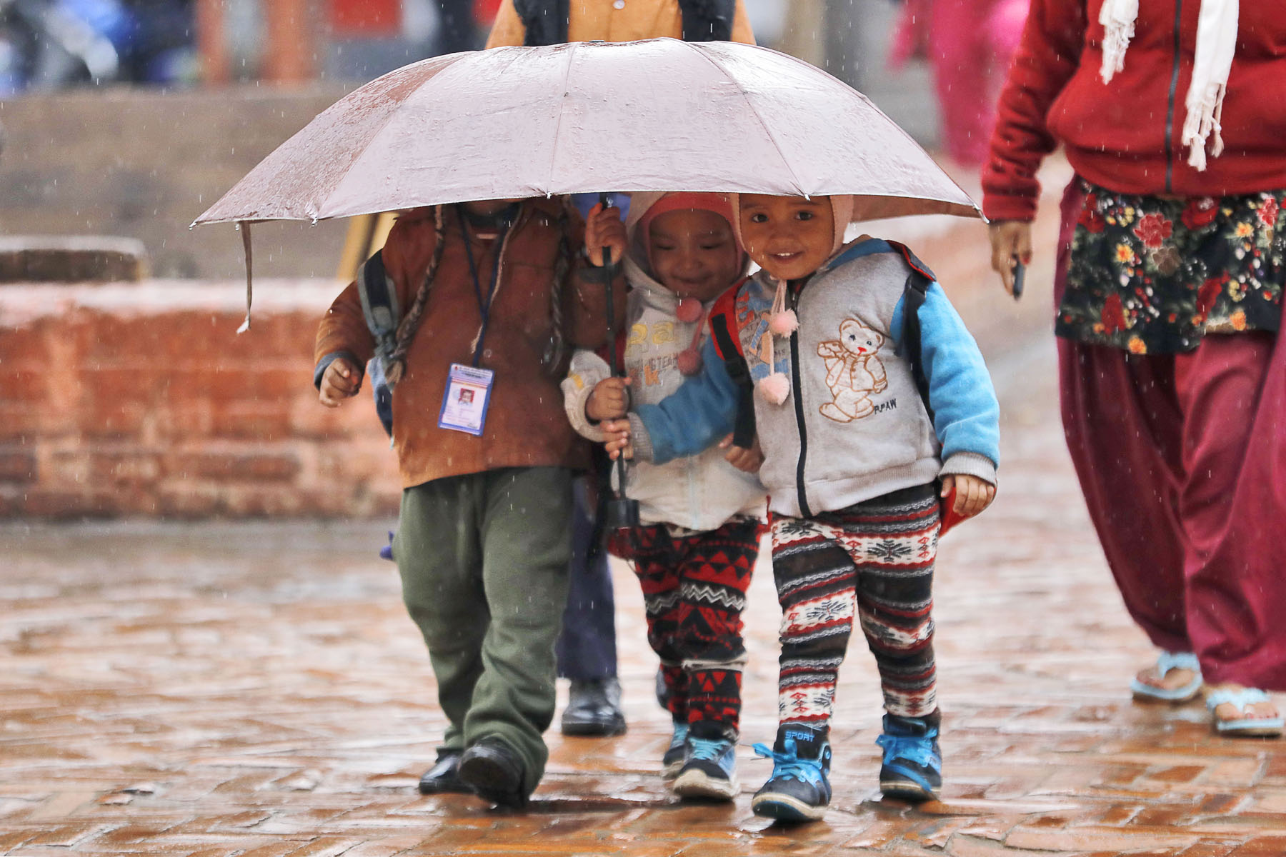 Children huddled under an umbrella return home from school. The Kathmandu Valley witnessed the first rainfall of this winter season on Friday. Sanjog Manandhar/TKP