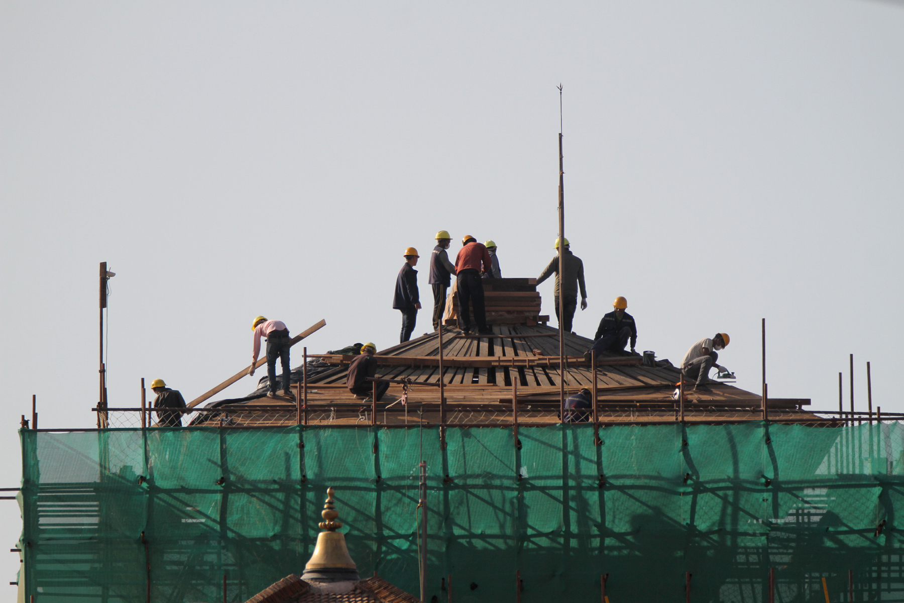 Workers build the pinnacle of the nine-storey durbar, as part of reconstruction of the monument damaged by the 2015 earthquake, in Kathmandu. Beeju Maharjan/TKP