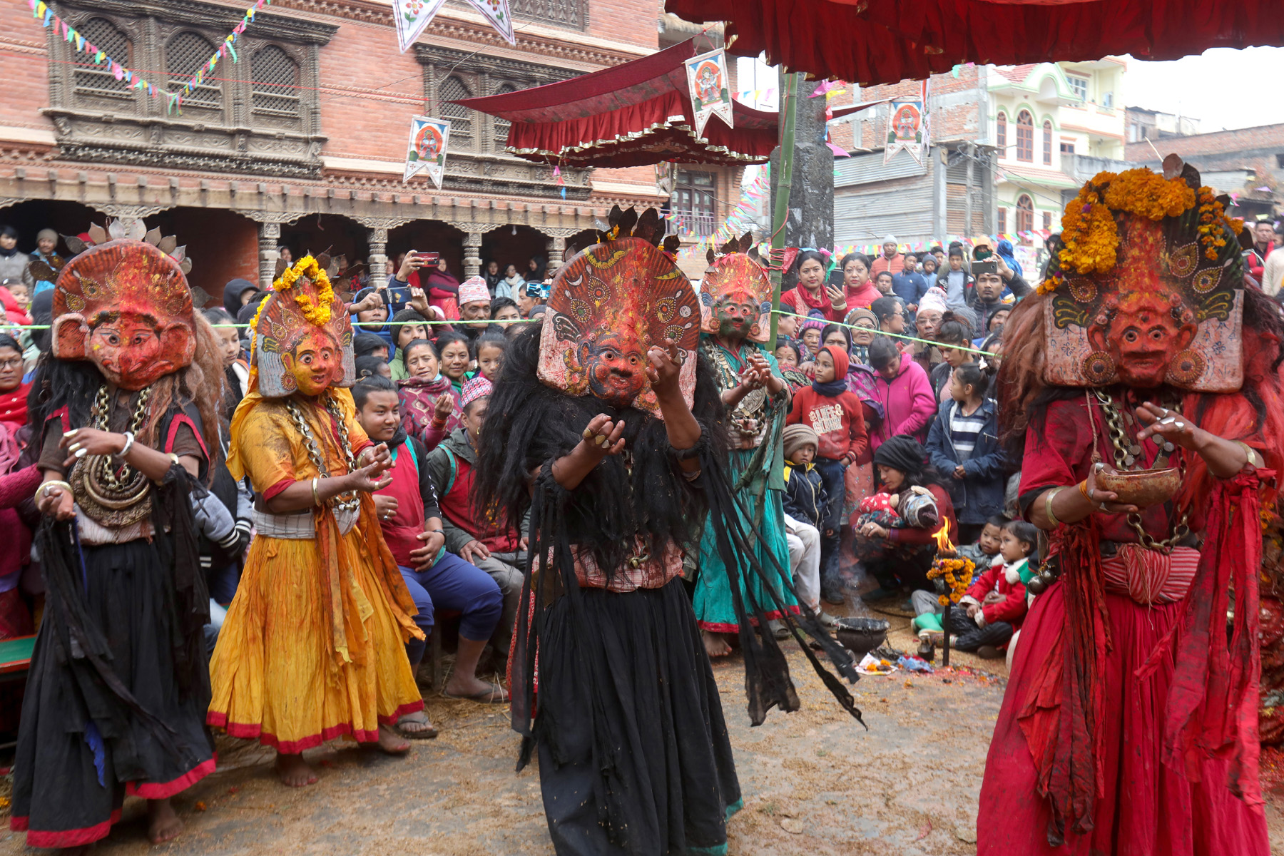 Masked dancers put up a performance to celebrate Thecho Jatra at Thecho, Lalitpur, on Friday. Elite Joshi/TKP
