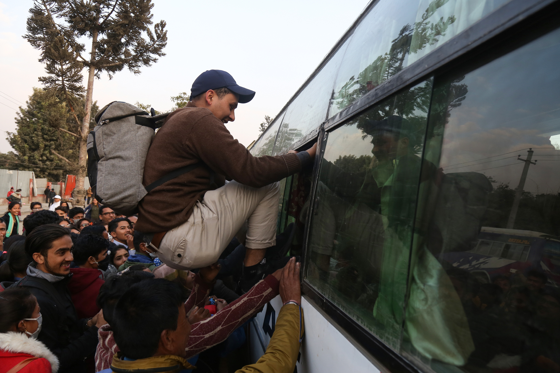 People try to get into a bus at Ratnapark in Kathmandu on Tuesday. There were fewer vehicles on the city roads, as the authorities had enforced an odd-even rule for vehicles on the concluding day of the 13th South Asian Games. Kabin Adhikari/TKP