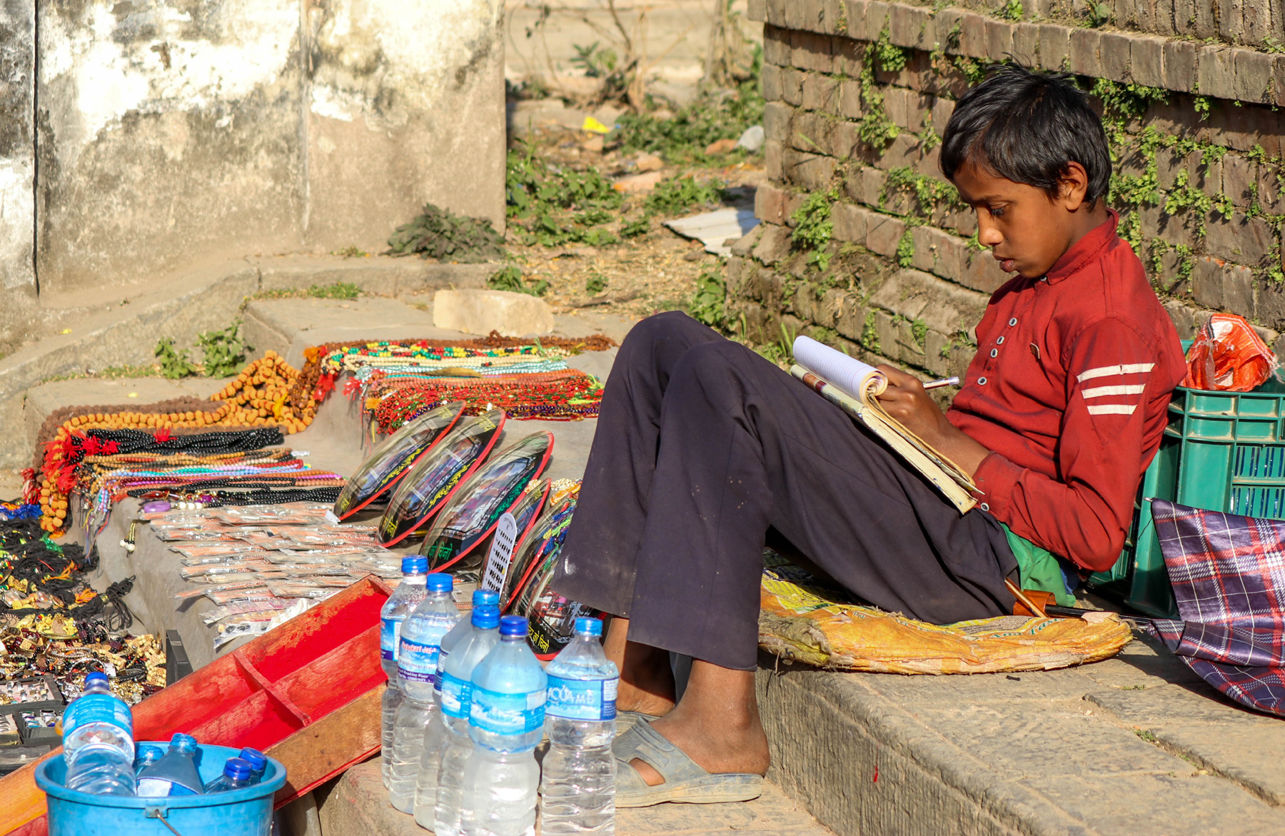 Govinda Kumar studies as he waits for customers in Pashupati, Kathmandu. Kumar, 14, was forced to leave school after his father’s sudden demise and take up responsibility to be the breadwinner of his family. Pratham Bista/TKP