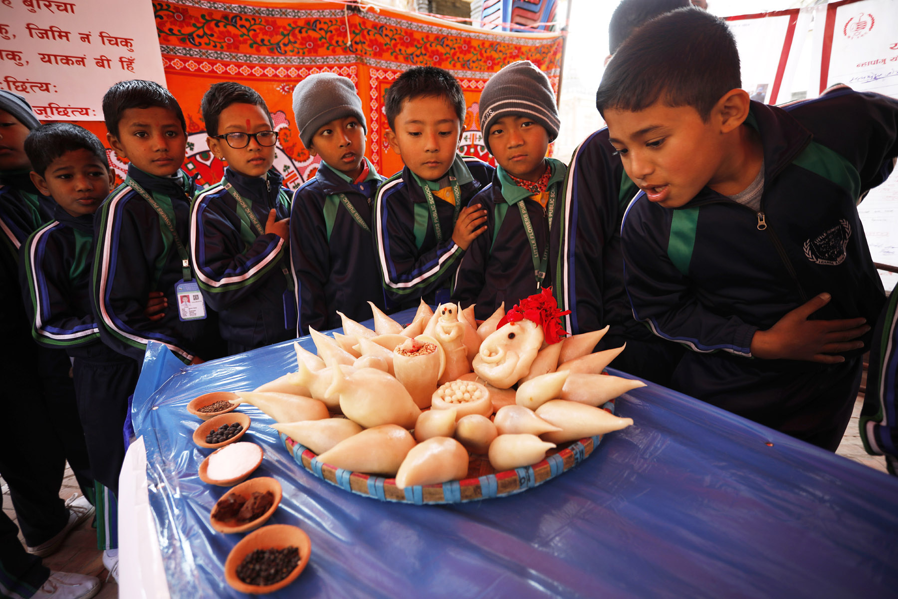 Schoolchildren look at different varieties of Yomari (a Newar delicacy) during Yomari Bojya (a Yomari exhibition) at Patan Durbar Square, Lalitpur, on Tuesday. Sanjog Manandhar/TKP
