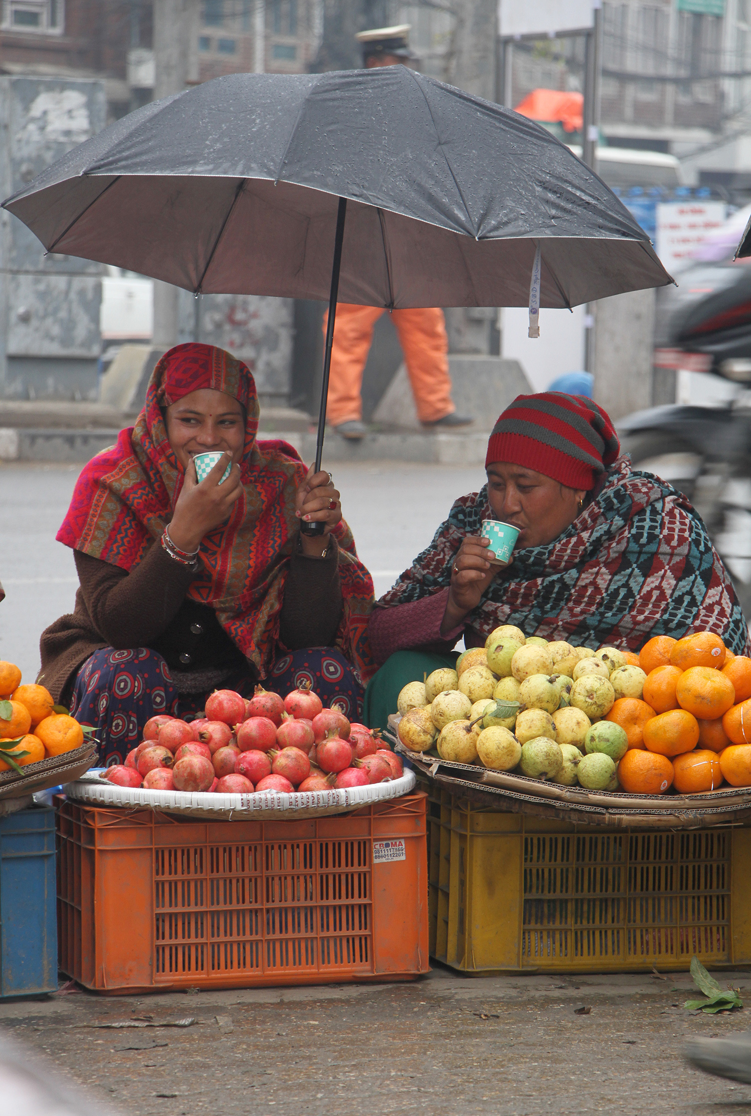 Fruitsellers sip tea on a cold rainy afternoon on the footpath outside the Kalimati fruit and vegetable market in the Capital on Wednesday. Beeju Maharjan/TKP