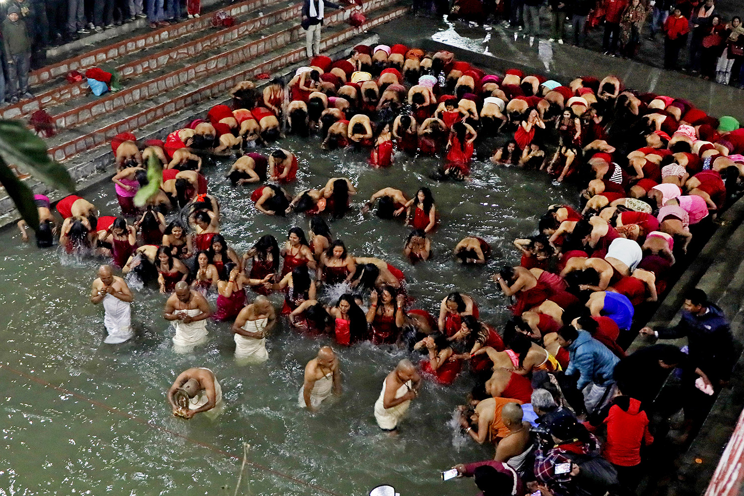 Devotees bathe in the Shalinadi river on the first day of the month-long Swasthani ritual in Sankhu, Kathmandu, on Friday. Post photo