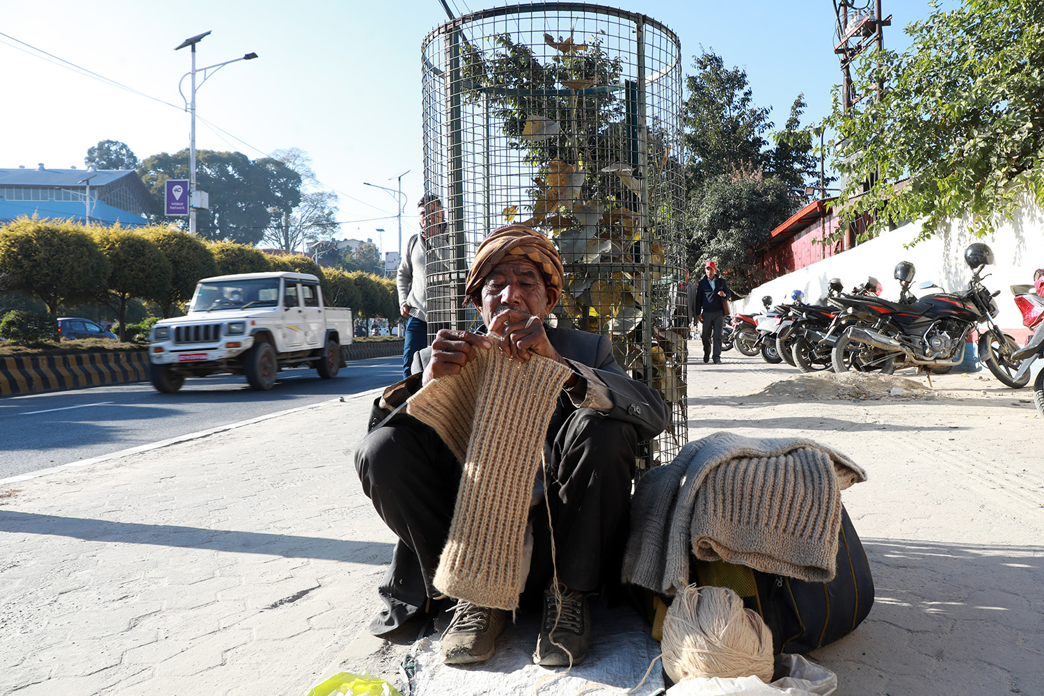 A man knits a woollen sweater on the sidewalk in Babarmahal, Kathmandu. The sweater is sold for Rs 1,000 per piece. Elite Joshi/TKP