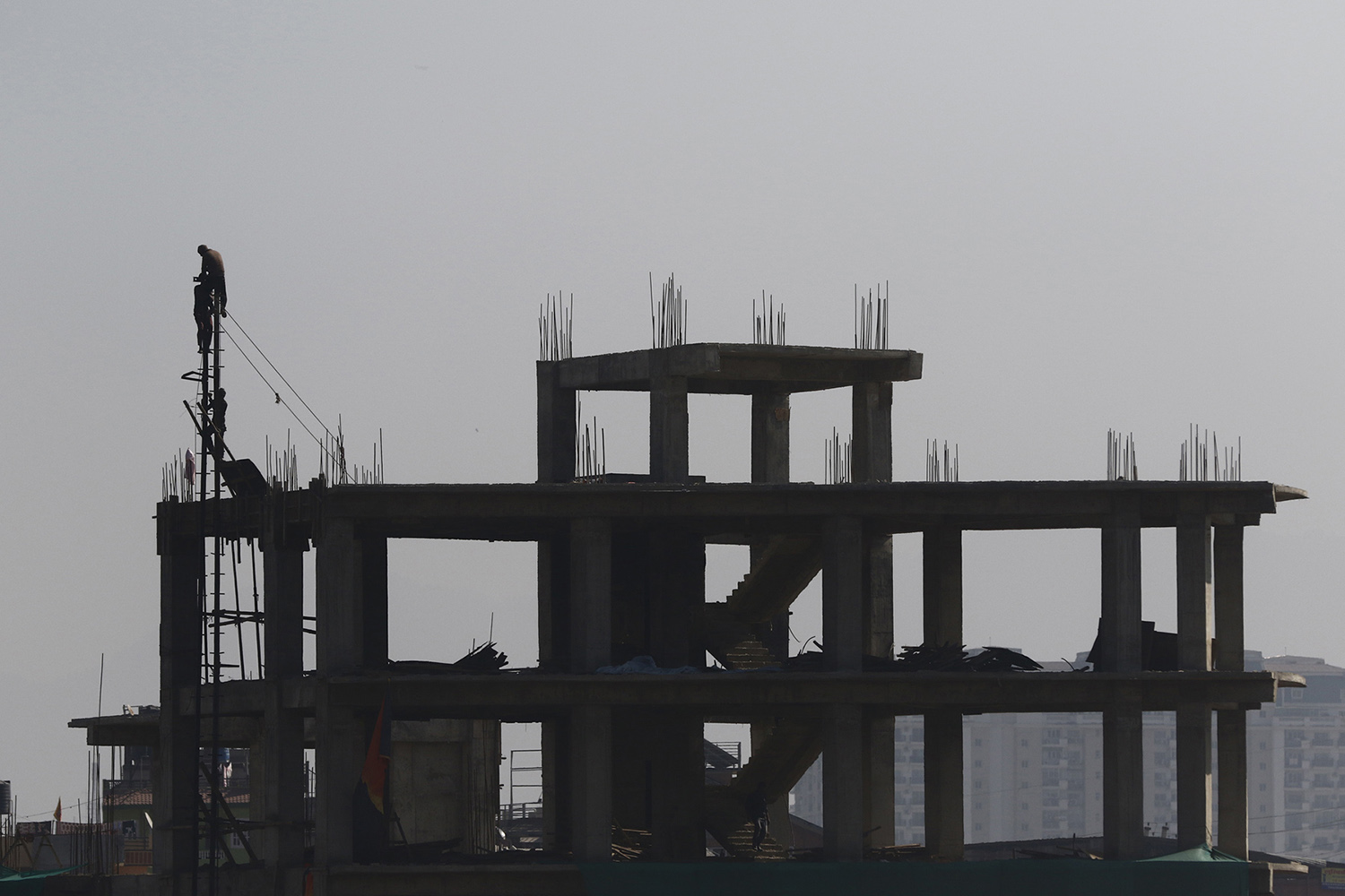 Construction workers on the fifth floor of an under-construction building at Balkhu in the Capital. Workers are often seen doing dangerous jobs without any safety gear around the City. Keshav Thapa/TKP
