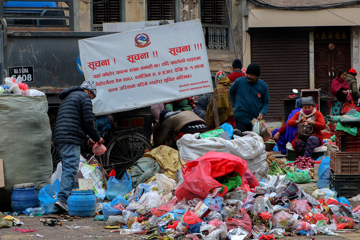 Garbage is strewn in front of a notice board that prohibits people from throwing rubbish in public spaces at Lagan Tole, Kathmandu, on Friday. Sujan Dangol/TKP