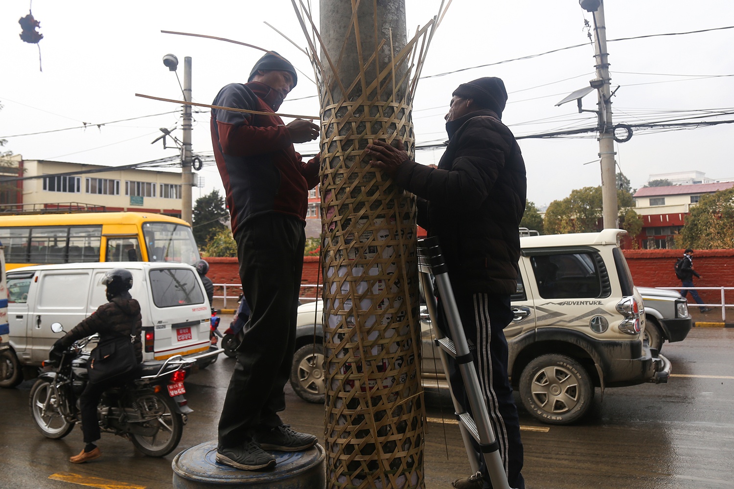 Artists from Dolakha cover up electricity poles by weaving together bamboo strips in Thapathali, Kathmandu, on Thursday. Kabin Adhikari/TKP
