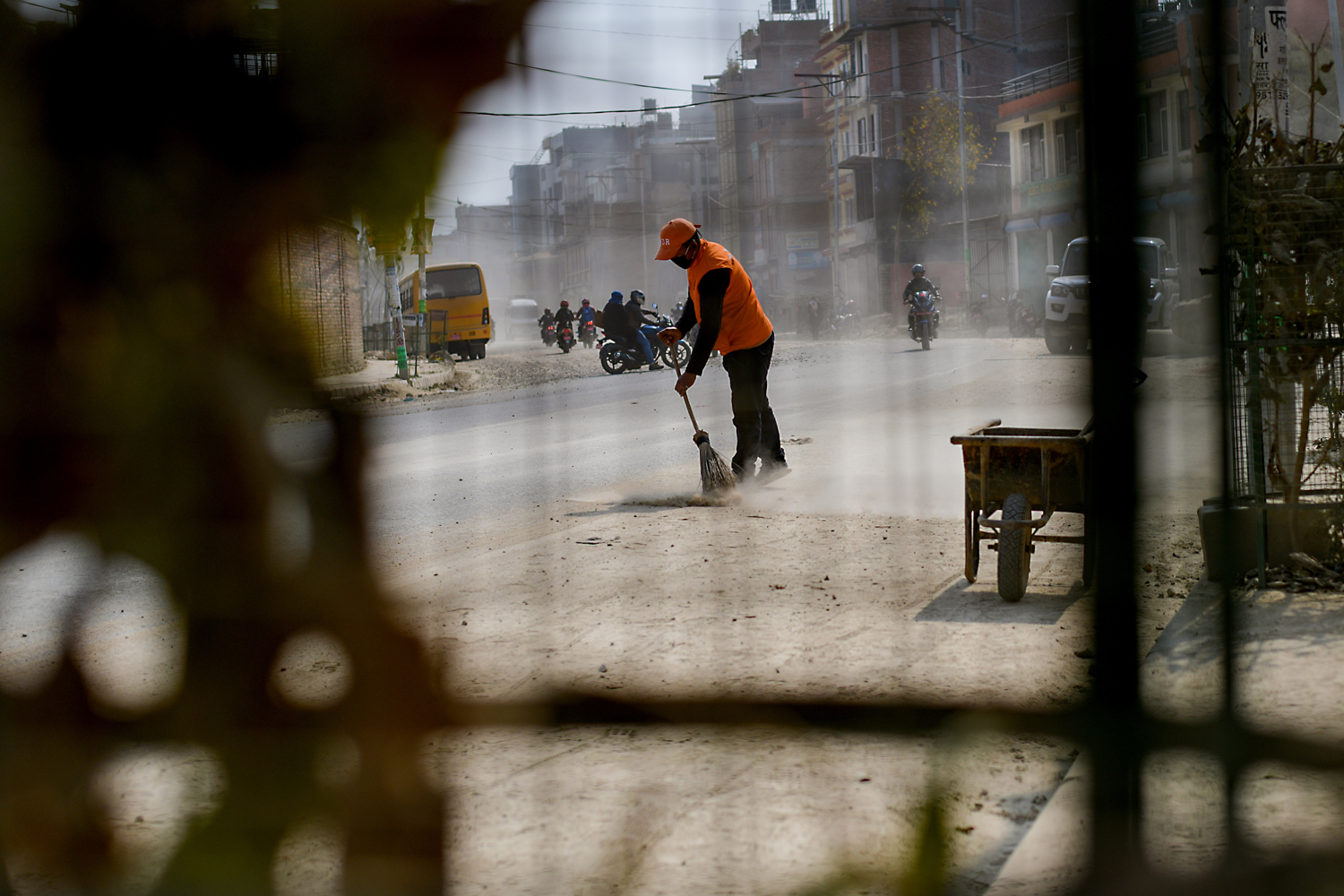 A worker from the Department of Roads sweeps the streets in Lagankhel, Lalitpur. Deepak KC/TKP