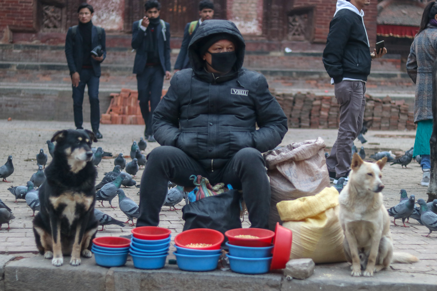 A pigeon feed seller waits for customers in Hanuman Dhoka Durbar Square, Kathmandu. Sujan Dangol/TKP