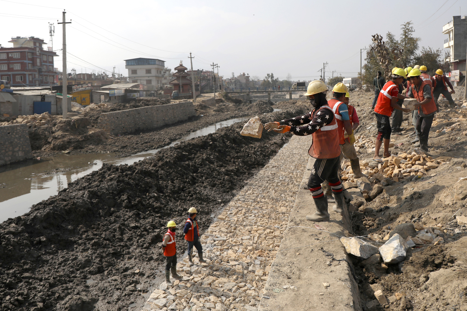 Workers at a construction site of a retaining wall for Hanumante corridor in Lokanthali. The corridor is expected to reduce the traffic along Jadibuti-Koteshwor road. Elite Joshi/TKP