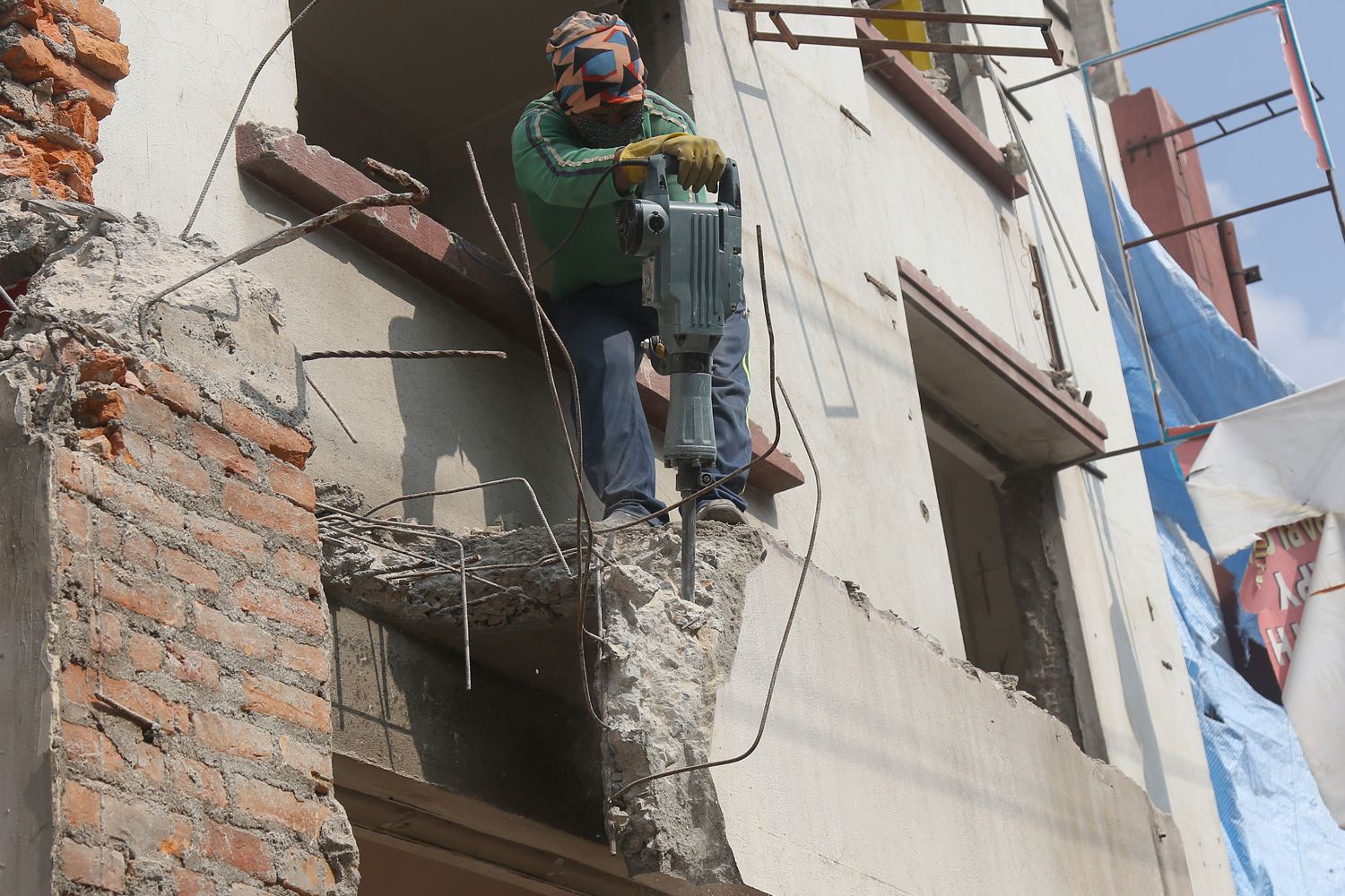 A worker uses a jackhammer to break a concrete slab of an old house in Kamalpokhari, Kathmandu. Kabin Adhikari/TKP